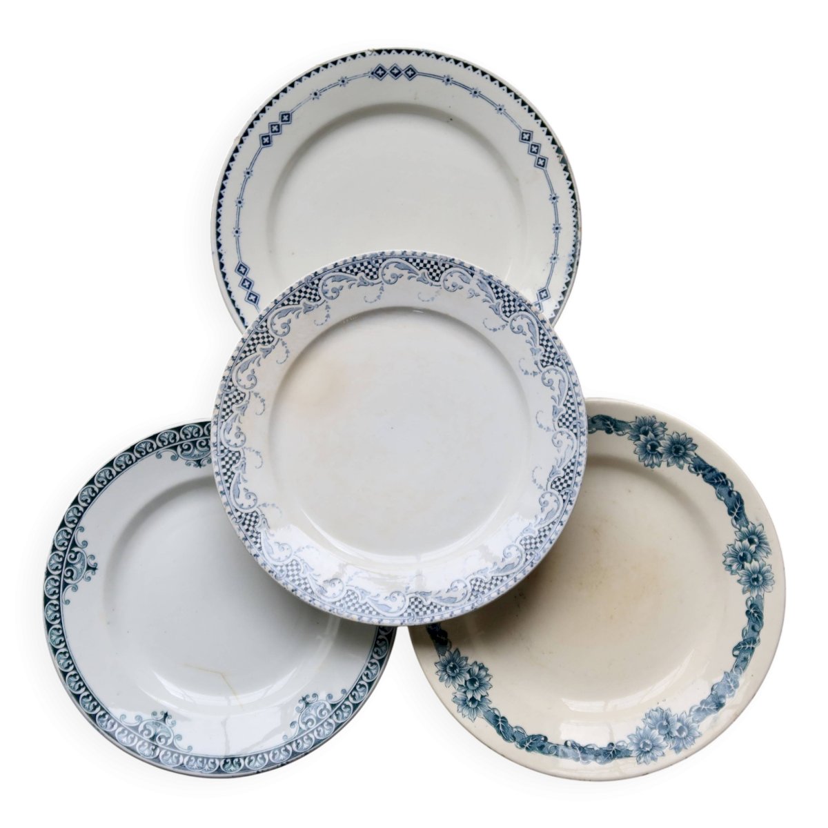 4 assiettes plates anciennes terre de fer faience bleue dépareillées