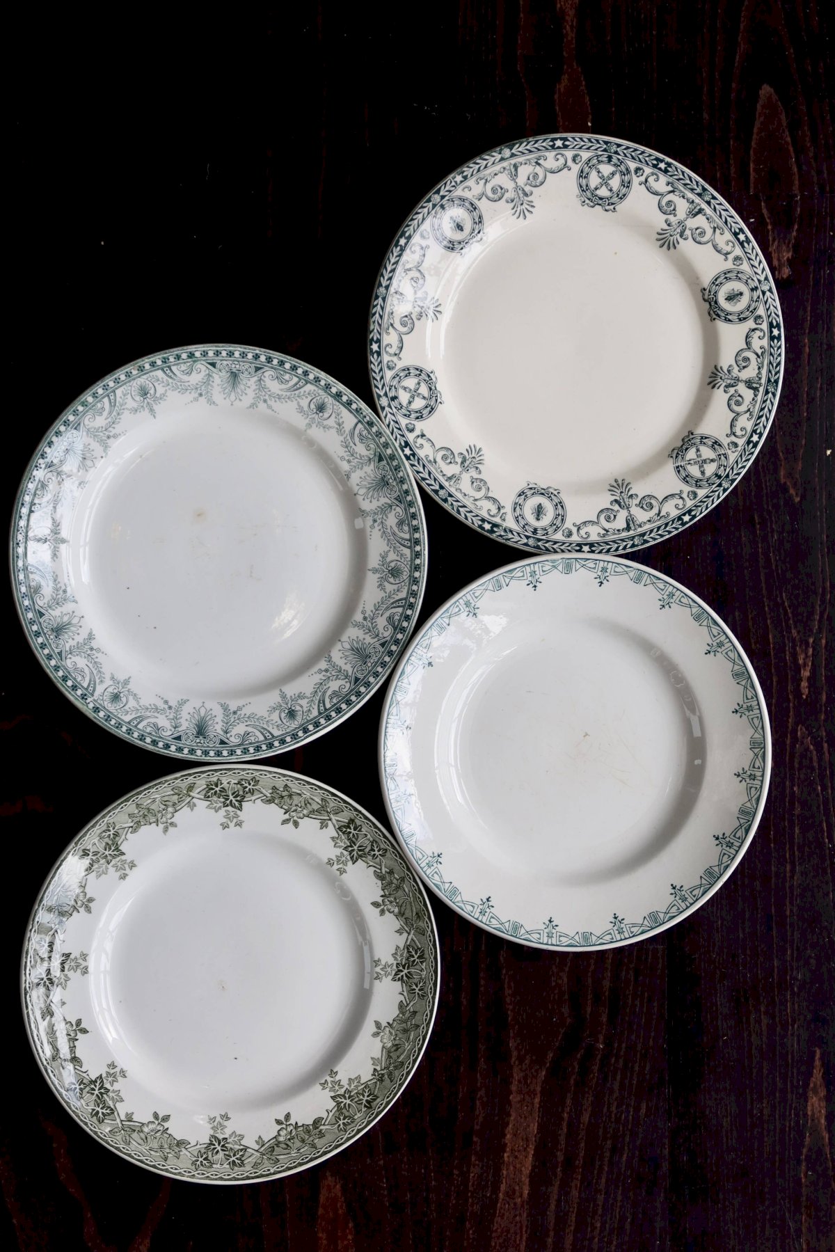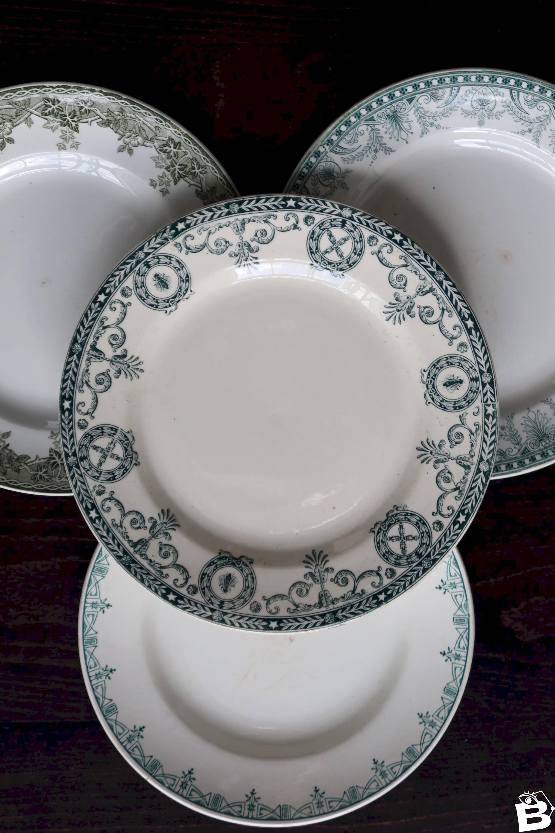 Assiettes plates vintage dépareillées terre de fer - Décor vert