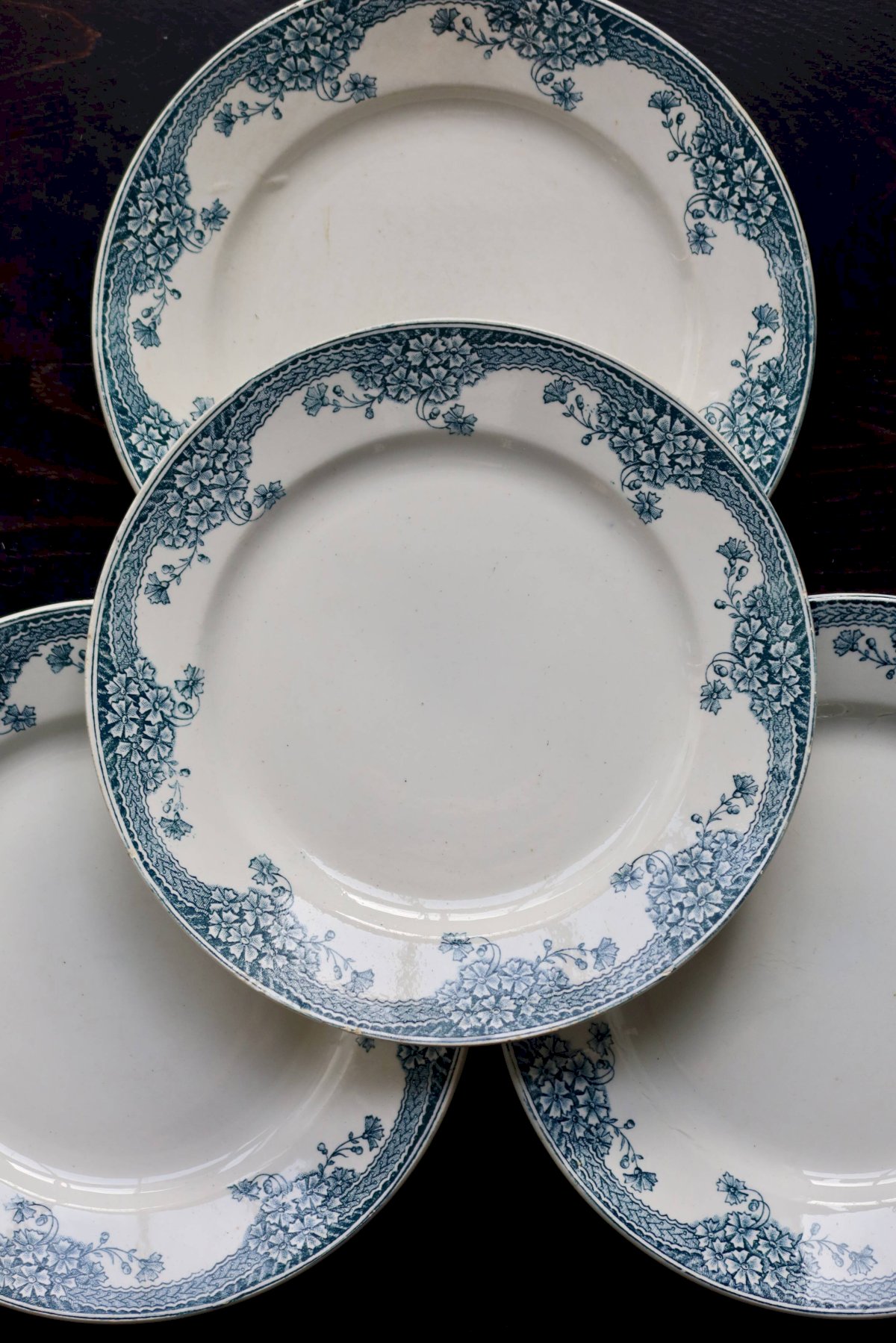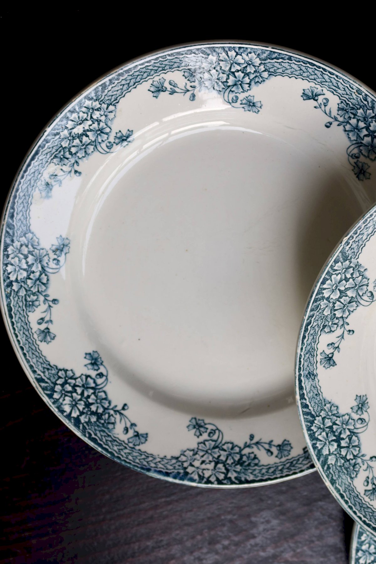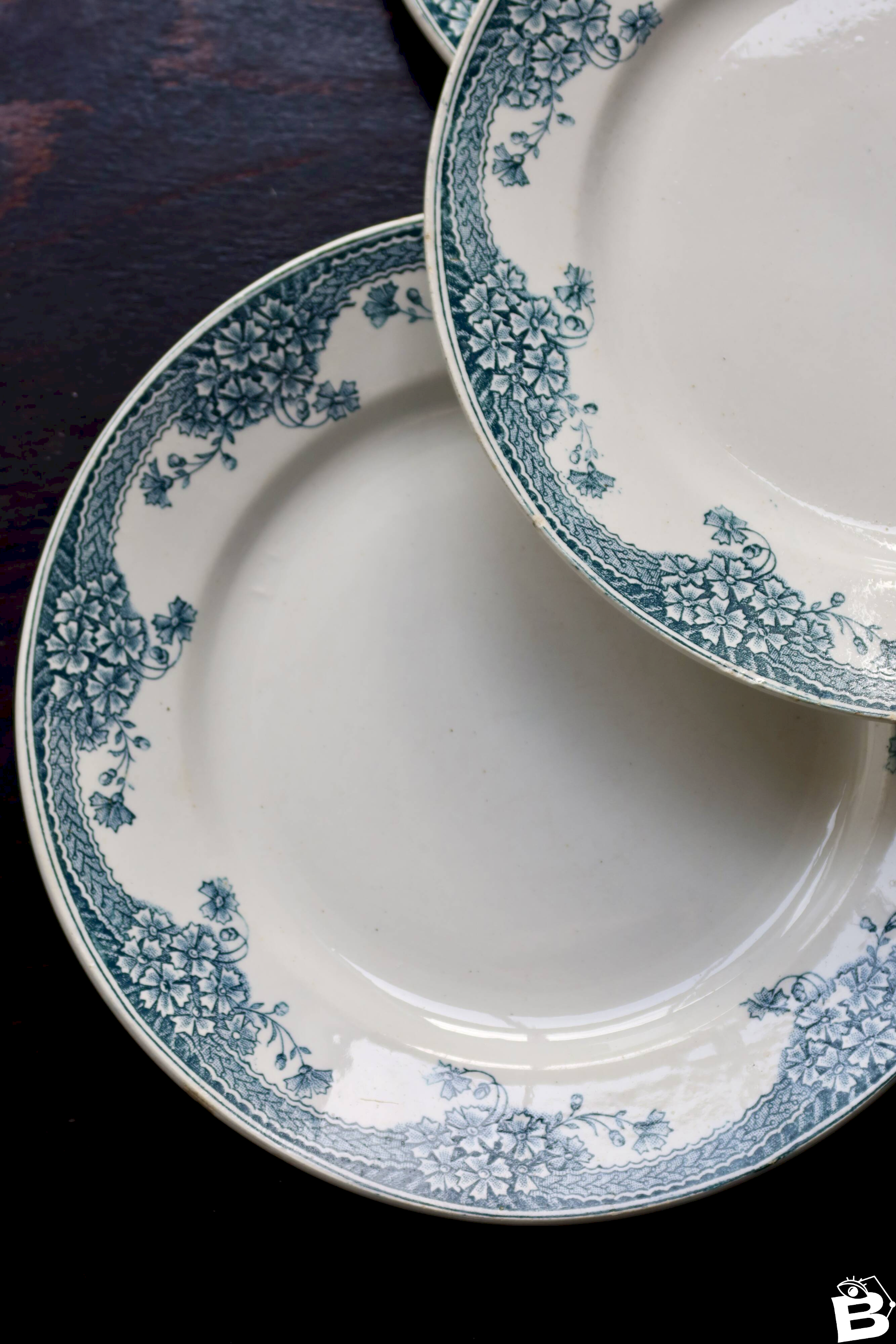 Belles assiettes plates en faïence blanche au motif Suzanne bleu-vert sur le marli, bord finement fileté, rendu délicat et lumineux.Patine d’époque (micro-craquelures et points de cuisson discrets, pas d’éclat majeur) pour une table bleue & blanche pleine de charme.Dimensions: 23cm de diamètre.