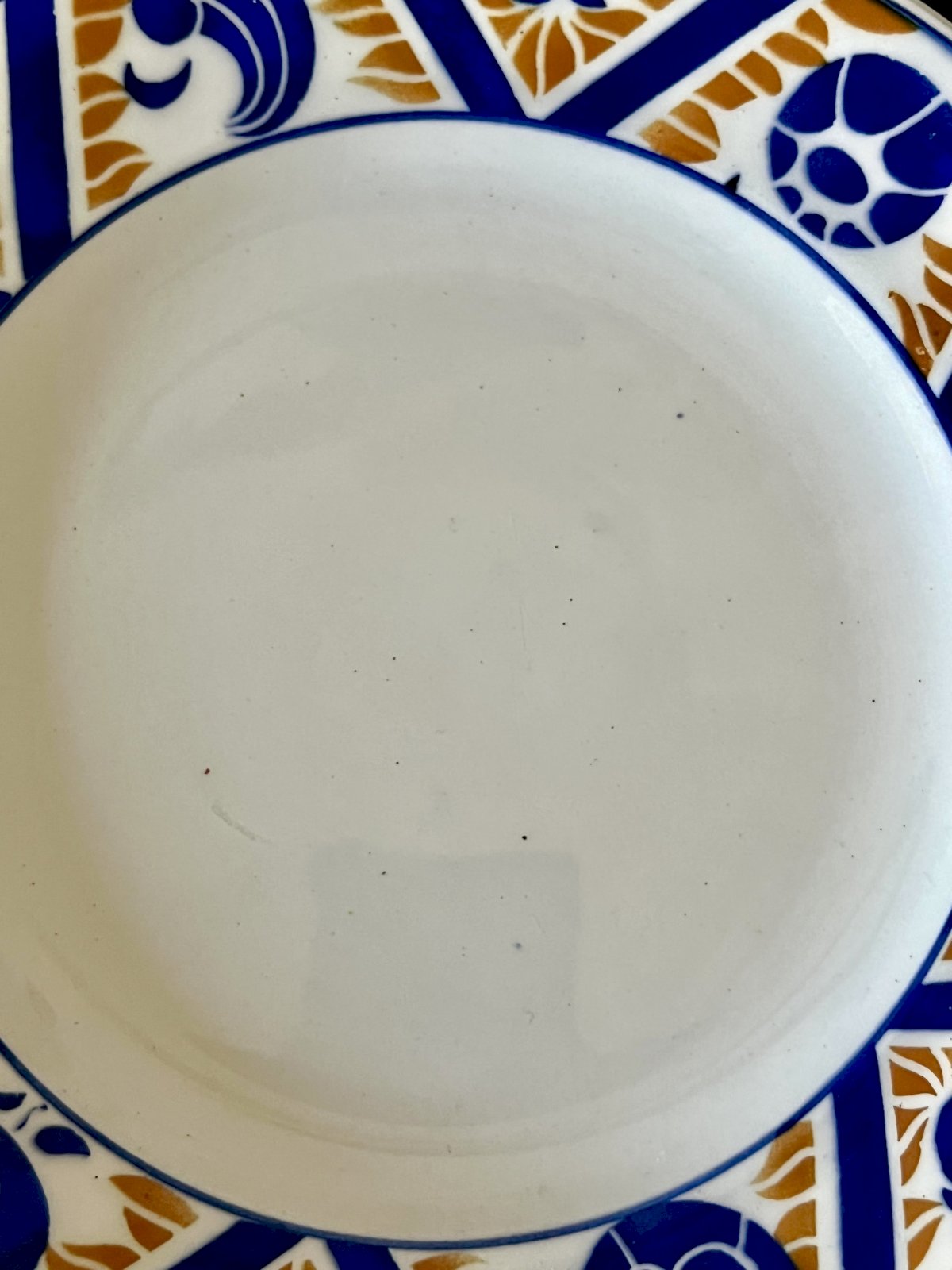Apportez une touche authentique et colorée à votre table avec ces 4 assiettes à dessert "CANADA", en porcelaine opaque à motifs bleus et ocres sur fond crème, peinture sur pochoir à l'aérographe.