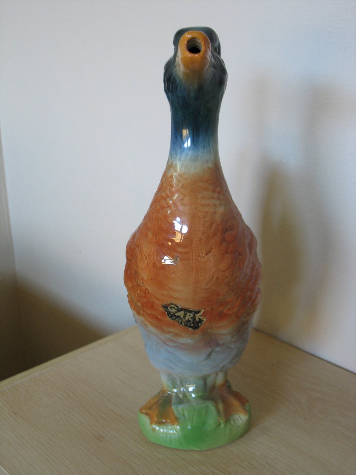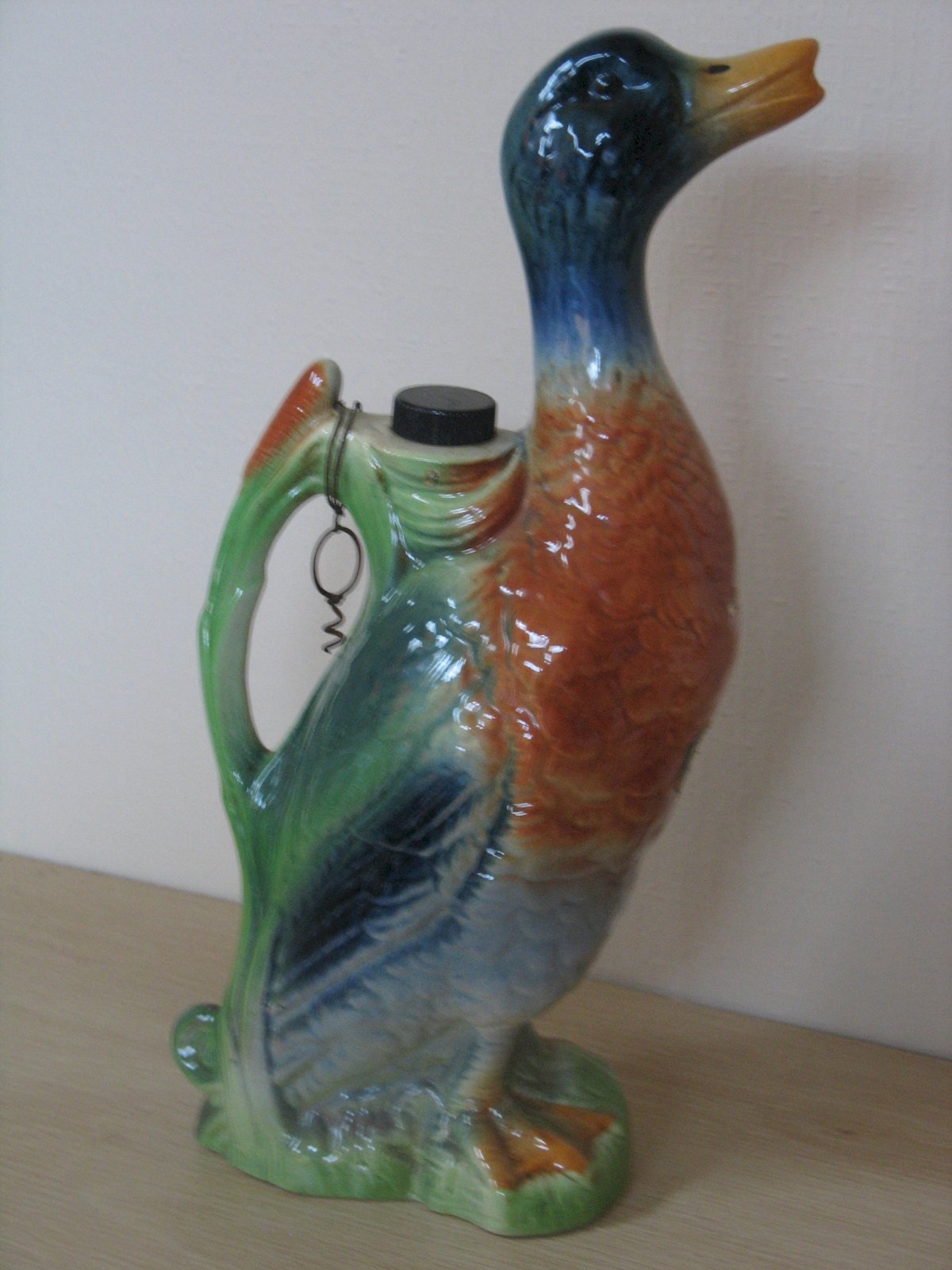 Superbe flacon à liqueur en faïence colorée représentant un canard.