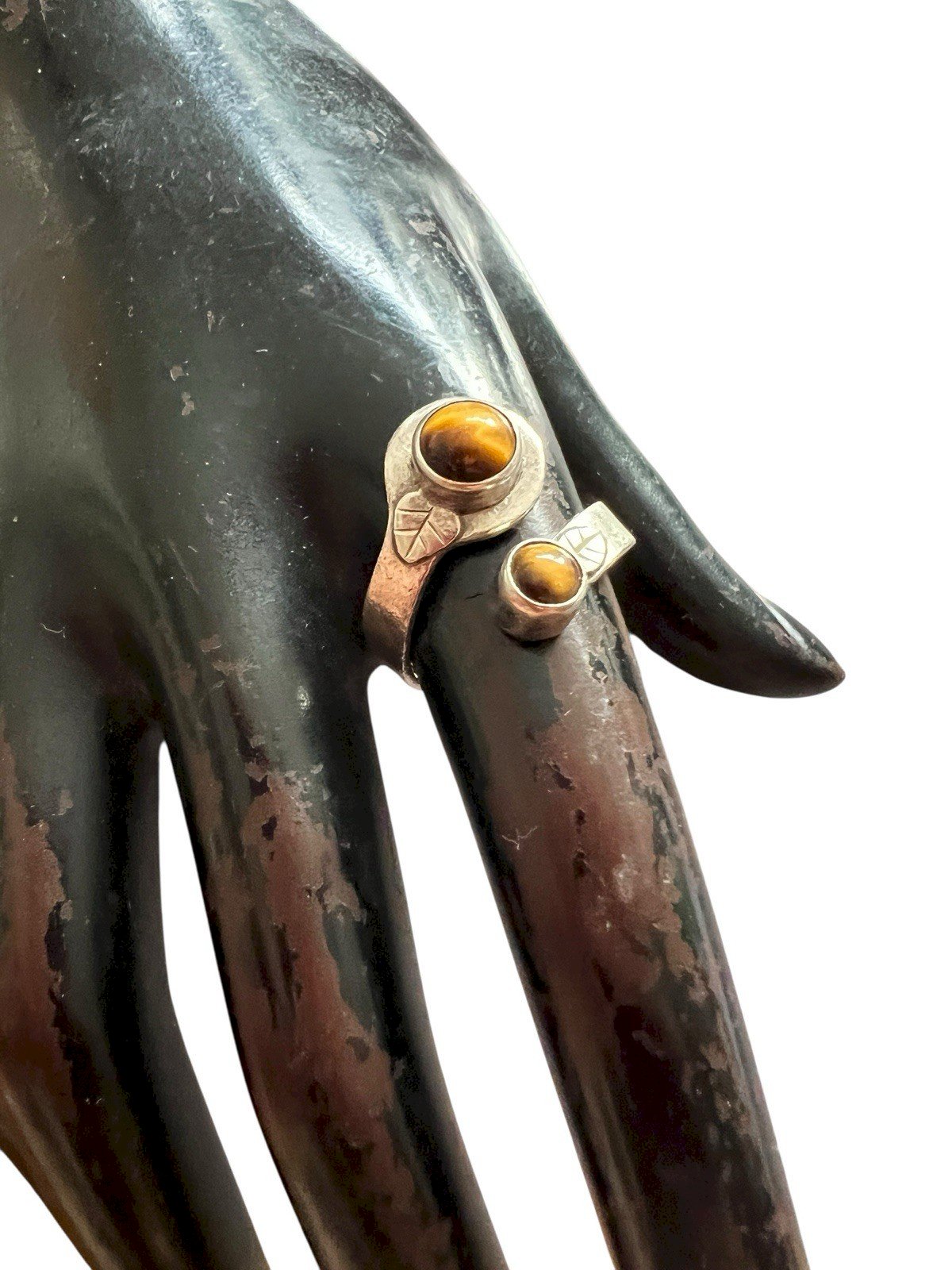 Bague ajustable en argent, massif, poissonnier, 925 à l’intérieur de Lanneau, serti de deux cabochon de Pierre, naturelles, œil de tigre. La bague peut s’agrandir et se rétrécir à la main. Le motif mesure environ 2 cm de hauteur. L’anneau environ 3 mm de hauteur. quelques usure d’usage, bon état vintage. État:Occasion: Objet ayant été porté. ...Occasion: Objet ayant été porté. les éventuelles imperfections. Pierre dominante:Œil De Tigre Marque:Vintage Type:Bague sertie Couleur dominante:Argenté Taille:Ajustable Matière:Pierre Métal:Argent sterling Forme de la bague:Serpent