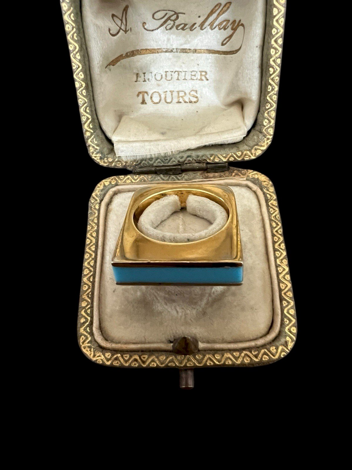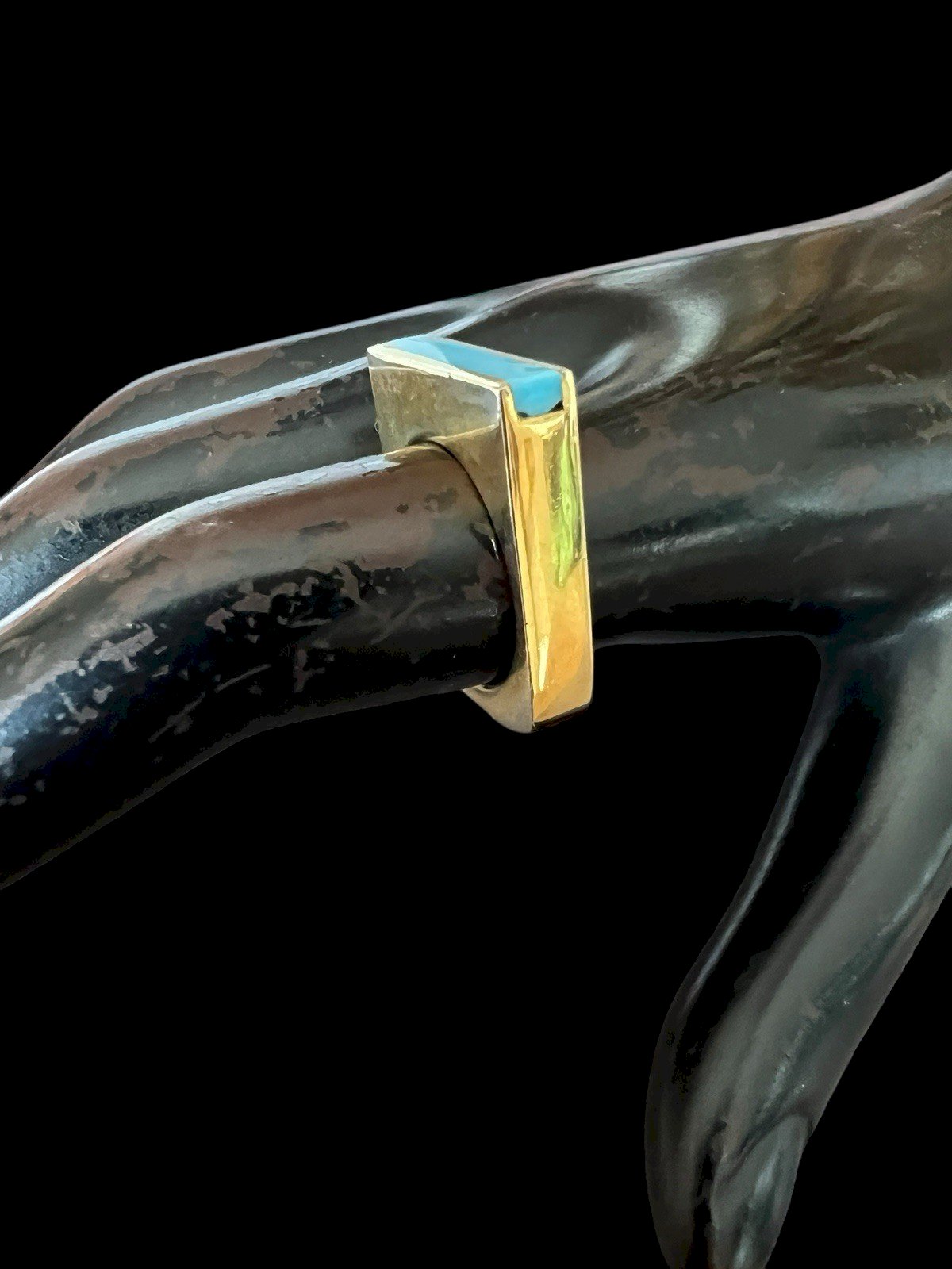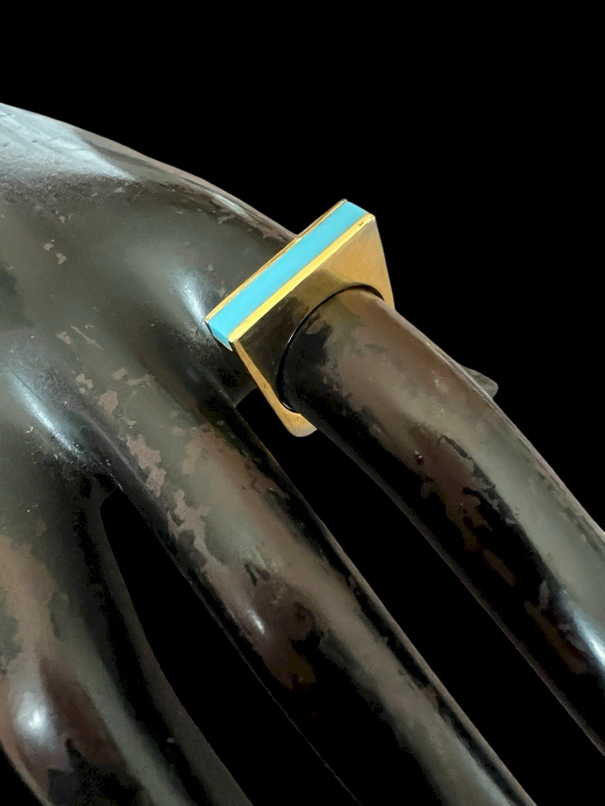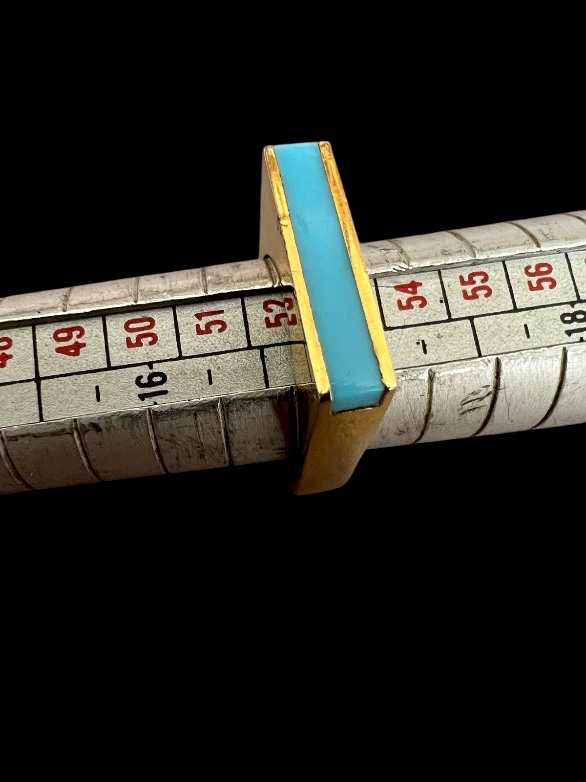 Bague design vers 1970 contemporaine moderne vintage. Bague en métal dorée, orné d’un motif en plastique turquoise. Quelques usures d’usage en particulier, Petit, manque de dorures aux extrémités. Bague vers 1970 Taille de la bague environ 52,5. FR Soit environ 16,7 mm de diamètre. L’écrin ne fait pas partie du lot État:Occasion: Objet ayant été porté. ...Occasion: Objet ayant été porté. les éventuelles imperfections. Marque:Bague vintage Type:Bague sertie Taille:52 Matière:Plastique