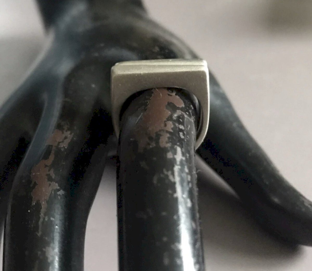 Bague Double Articulée Géométrique Design Contemporain Argent Massif Vintage. Bague sculpturale au design architectural unique composée de deux anneaux pivotants reliés par un petit axe. Cette pièce audacieuse joue sur les contrastes de textures et de nuances avec une partie en argent lisse et brillant et une seconde partie au fini légèrement granuleux d’un gris plus soutenu. Sa forme géométrique moderne et son mouvement fluide en font un bijou de créateur original et sophistiqué. Etat : Très bon état (testée à l'acide) et poinconnée a l’intérieur Taille : 53 FR (diamètre intérieur d'environ 16,8 mm) Poids : Environ 9,2 g Dimensions du plateau : Environ 1,8 cm de largeur État:Occasion: Objet ayant été porté. ...Occasion: Objet ayant été porté. les éventuelles imperfections. Couleur dominante:Argenté Pierre dominante:Aucune Pierre Marque:Vintage Design Type:Anneaux Double Taille:53 Matière:N Métal:Argent sterling