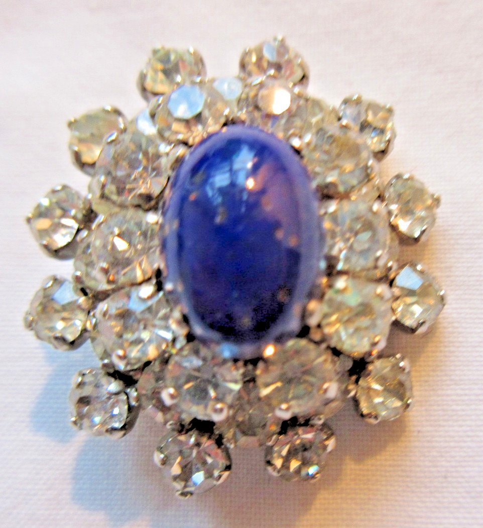 Bague femme, pierre bleue en dôme entourée de strass façon diamants
