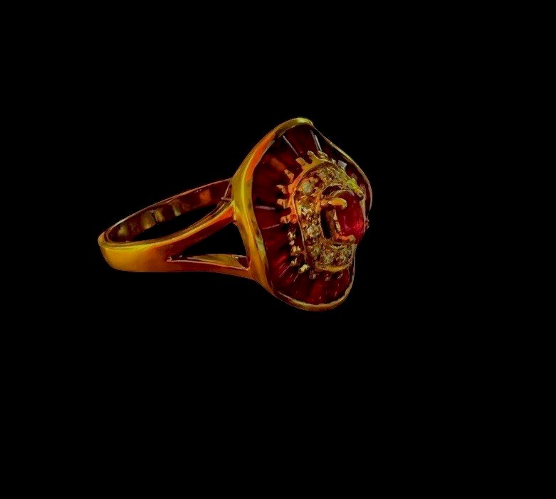 Bague vintage style art deco or 18k rubis. Belle bague cocktail en or jaune 18 carats (testée à l’acide), sertie d’un rubis central ovale d’environ 3–4 mm (≈0,25–0,35 ct), entouré de 24 rubis trapézoïdaux d’environ 2 mm chacun (≈0,6 ct au total), ainsi que de petits diamants disposés autour du motif central. • Métal : Or jaune 18 carats (testée à l’acide) • Poids total : ≈5,3 g • Taille : 56 (FR) • Pierres : • Rubis (non certifiés), poids total estimé ≈0,85–1 ct • Petits diamants • État : Très bon état général État:Occasion: Objet ayant été porté. ...Occasion: Objet ayant été porté. les éventuelles imperfections. Pierre dominante:Rubis Type:Bague sertie Style:Art Deco Taille:56 Pureté métal:18 carats Style:Art Deco Couleur pierre dominante:Rouge Métal:Or jaune Pierre secondaire:Diamants Type:Bague sertie Création pierre dominante:Origine indéterminée