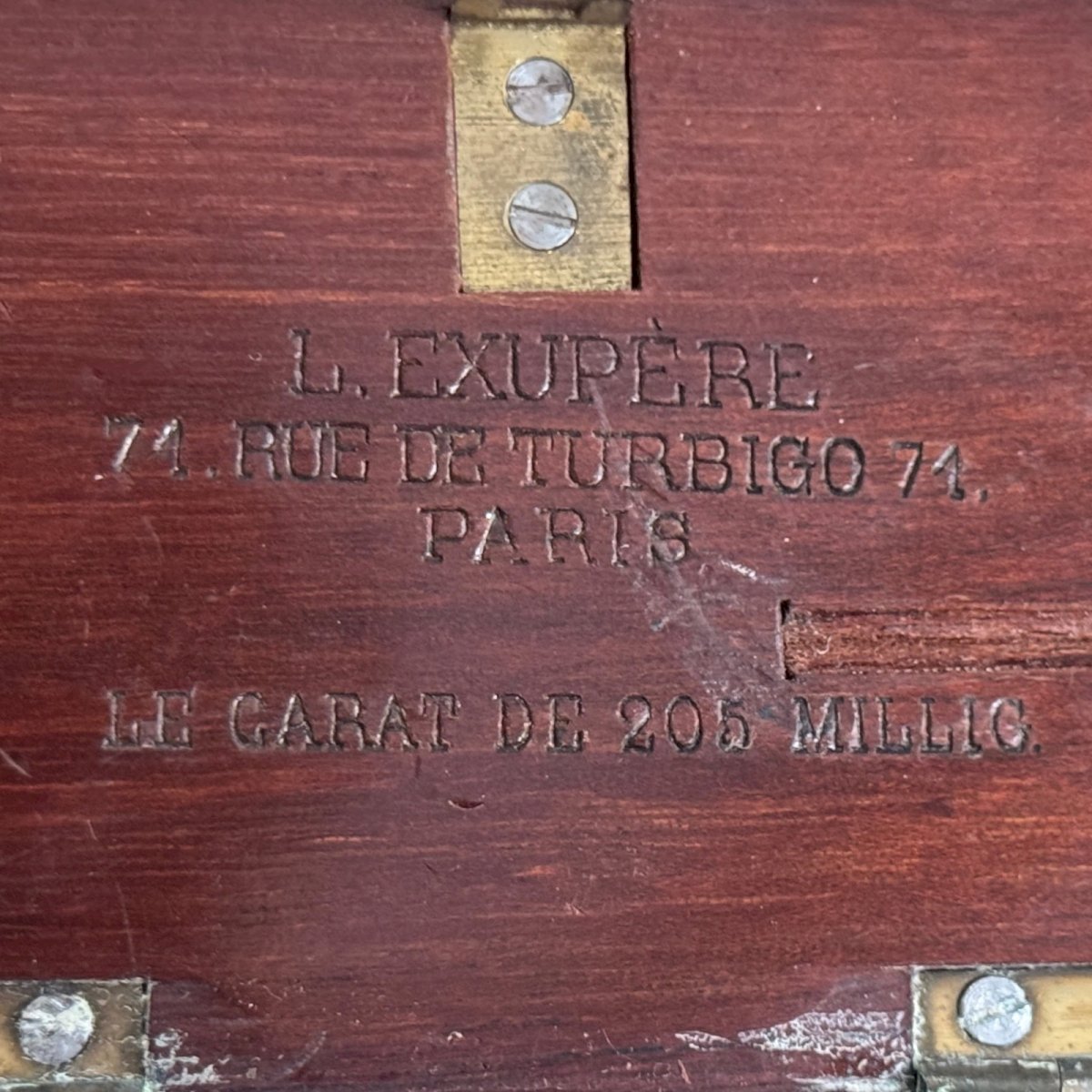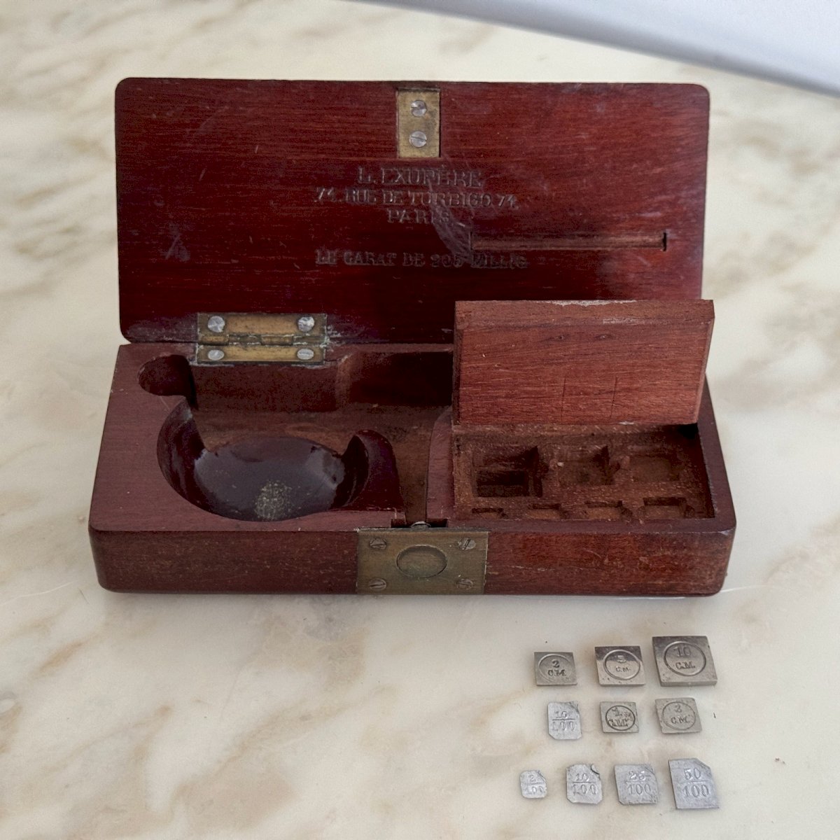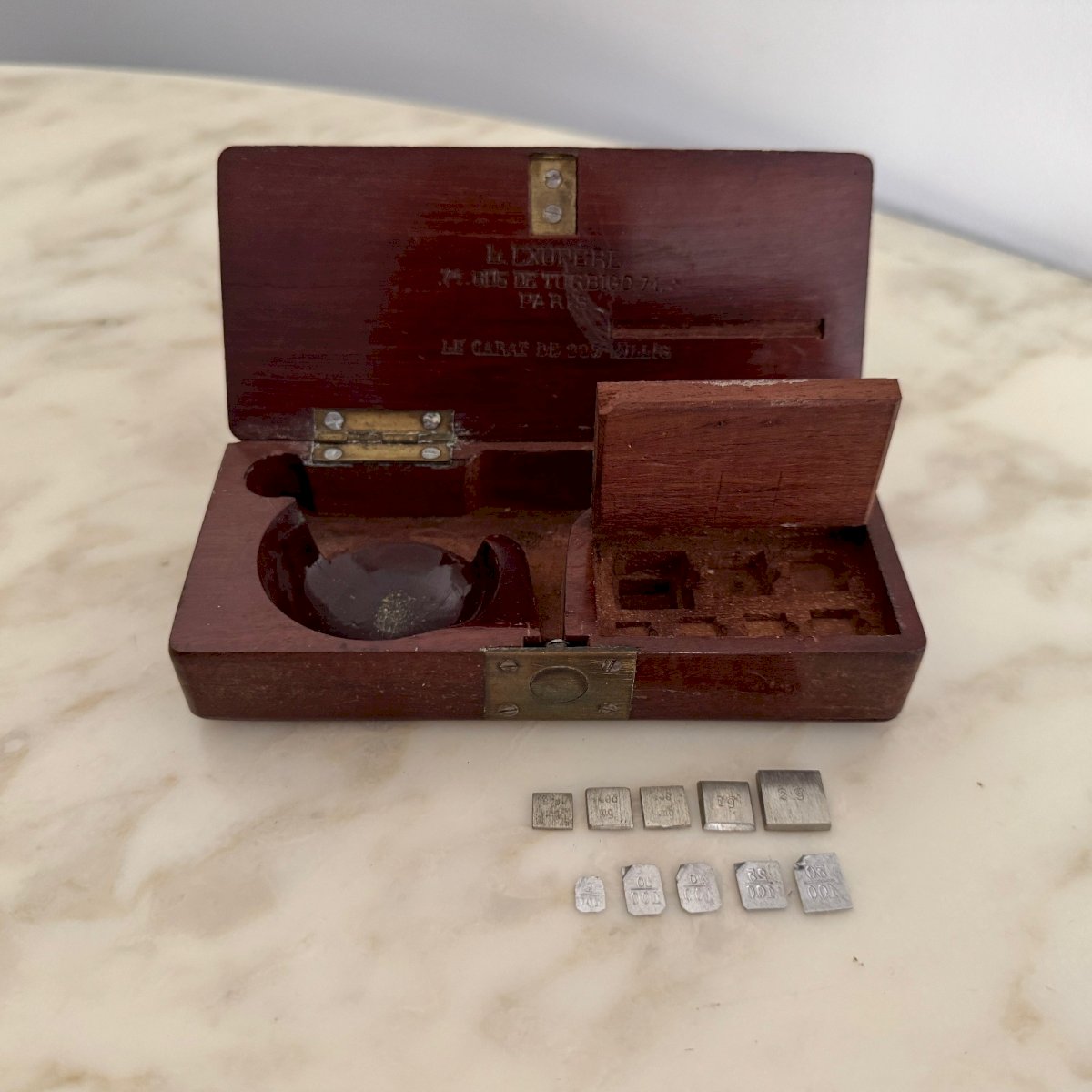Balance de précision trébuchet en acajou XIXe par L. Exupère Paris M3768 Cette balance de précision utilisée pour les carats est en état d'usage. Nous vous présentons sur les photos tous les éléments dont nous disposons. Pour l'état, notons des petites traces classiques d'usure dues à l'usage. Nos photos vous permettent d'apprécier la qualité de l'objet. Pour l'état, merci de bien détailler les photos. N'hésitez pas à zoomer . Les photos font partie intégrante de la description. Dimensions : - Boitier  Hauteur : 3,8 cm Largeur : 12,5 cm Profondeur : 5,6 cm - Balance Hauteur : 18 cm Largeur : 11,2 cm Diamètre : 3,6 cm   Je reste à votre disposition pour toute question. État:OccasionObjet ayant été utilisé. les éventuelles imperfections. Type:Calcul, Mesure Pays d'origine:France Sous-type:Balance