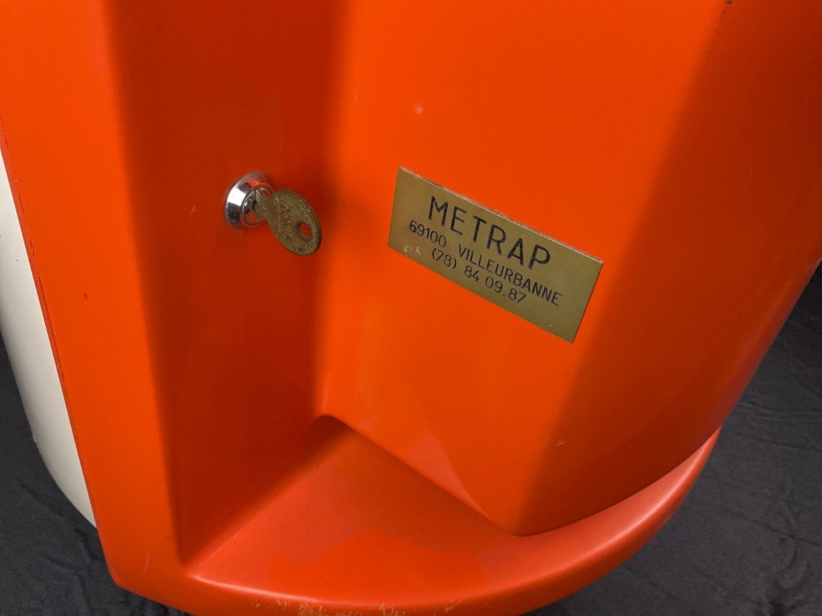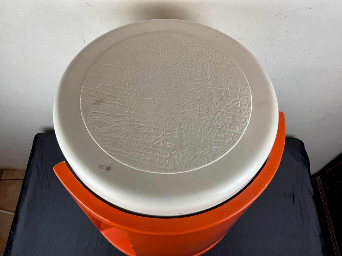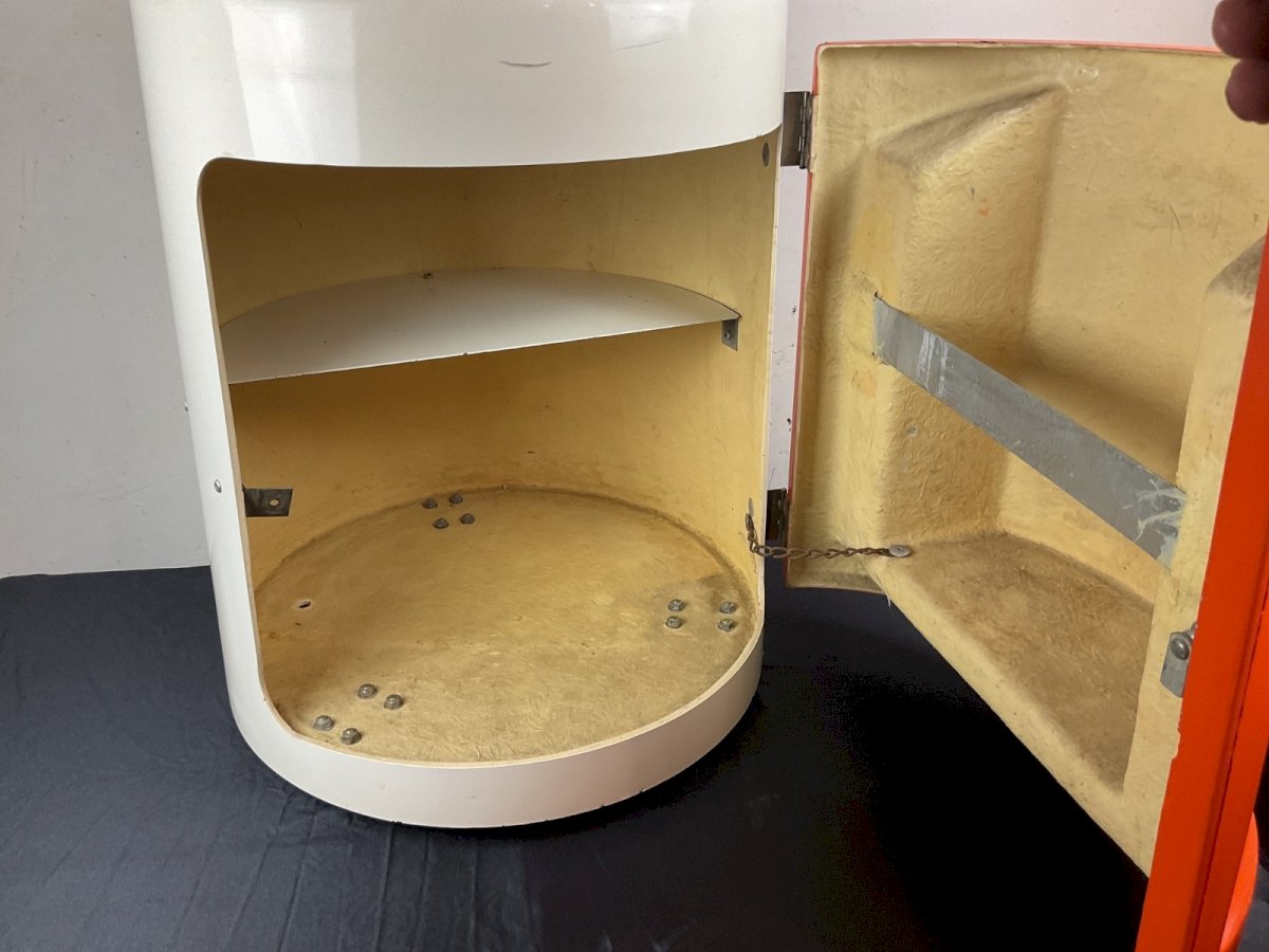 BAR roulant VINTAGE 1960-70 SPACE AGE fibres de verre Diamètre : 45 cm Hauteur : 54,5 cm Couleur:orange et blanc Type:Bar Origine:France Matière:fibre de verre Style:Vintage