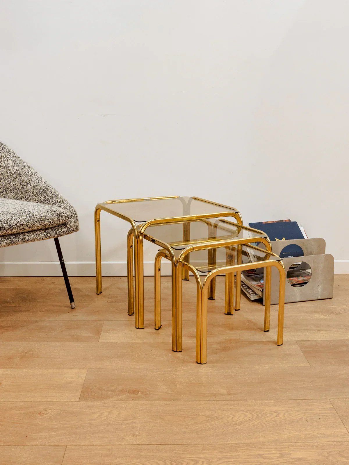 Invitez ces trois tables gigognes au plateau en verre et à la structure dorée dans votre intérieur, qui apportent une élégance délicate et un jeu de proportions modulable. Pensées pour s'imbriquer ou se déployer selon l'usage, elles offrent un point d'appui raffiné en bout de canapé, table d'appoint ou présentoir pour objets et plantes. Leur alliance de verre lumineux et de métal doré confère une atmosphère chaleureuse et sophistiquée à un salon contemporain ou une entrée. Quelques traces du temps présentes. Dimensions de la plus grande : Longueur : 46 cm Largeur : 46 cm Hauteur : 40 cm Dimensions de la moyenne : Longueur : 40 cm Largeur : 40 cm Hauteur : 36 cm Dimensions de la plus petite : Longueur : 34 cm Largeur : 34 cm Hauteur : 40 cm État:Occasion: Objet ayant été utilisé. Objet présentant quelques marques d'usure superficielle, ...Occasion: Objet ayant été utilisé. Objet présentant quelques marques d'usure superficielle, entièrement opérationnel et fonctionnant correctement. Il peut s'agir d'un modèle de démonstration ou d'un objet retourné en magasin après une courte période d'utilisation. les éventuelles imperfections. Marque:Debongout Type:Produit chiné Matériau:Verre, Métal Style:Contemporain Personnalisé:Tables gigognes