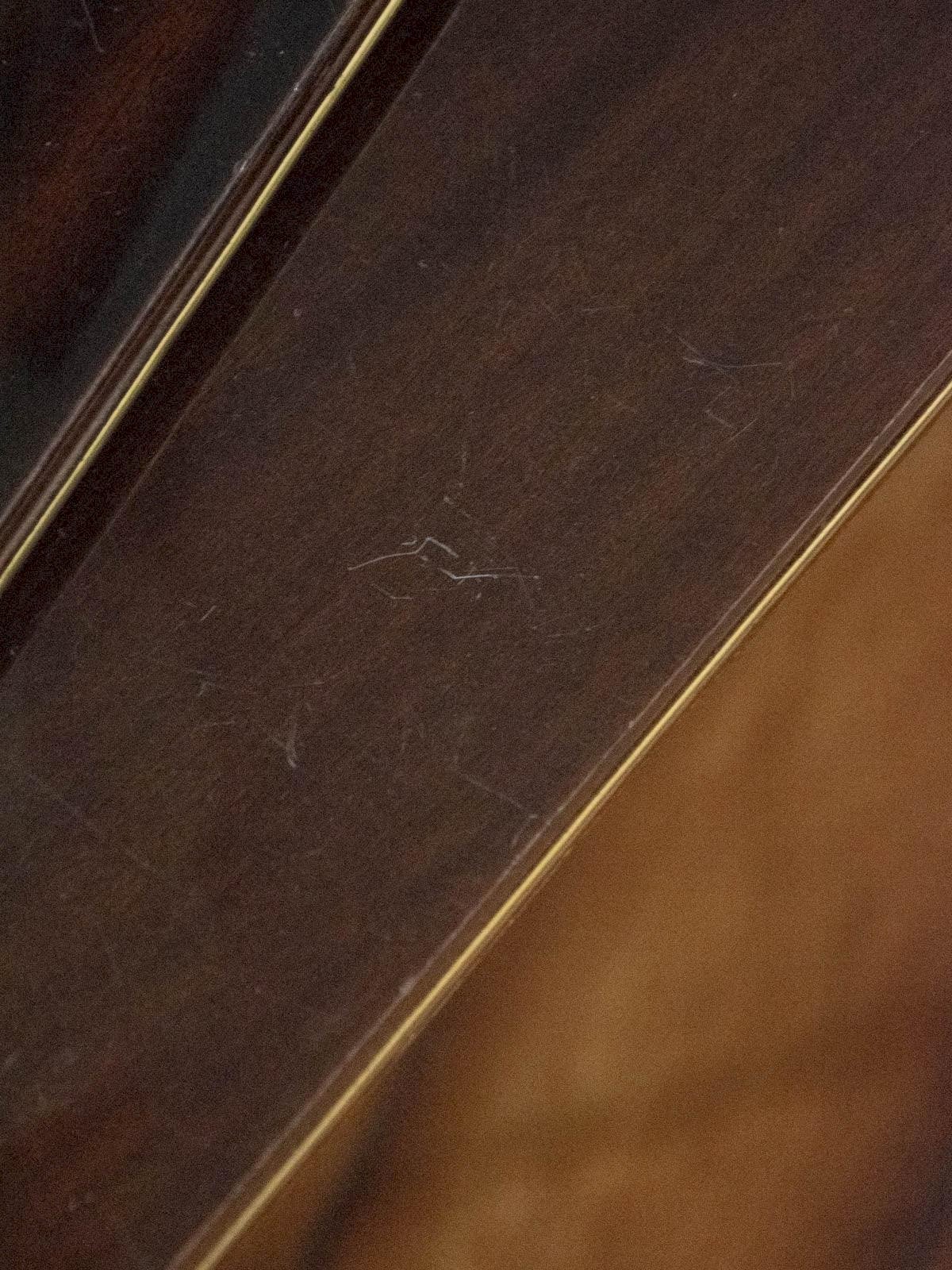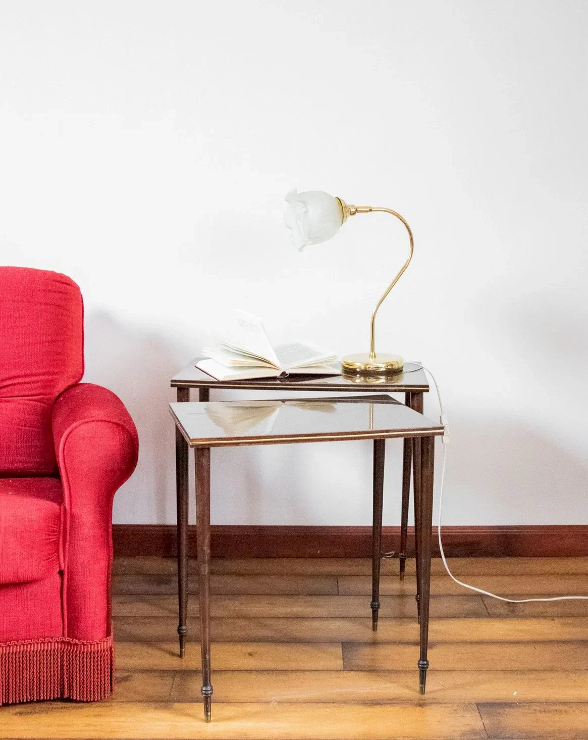 Apportez une touche de finesse à votre intérieur avec cette paire de tables gigognes au plateau plaqué et laqué, rehaussées d'un liseré doré qui souligne élégamment chaque contour; leur gabarit imbriqué optimise l'espace et permet d'installer une lampe, une tasse ou des objets décoratifs selon vos besoins, tandis que les pieds fuselés et leurs embouts métalliques apportent une délicate note sophistiquée. Quelques égratignures et un angle supérieur droit abîmé sur la plus petite table. Taille M : Longueur : 56 cm Largeur : 31 cm Hauteur : 54,5 cm Hauteur sous plateau : 52,5 cm Taille S : Longueur : 46,5 cm Largeur : 31 cm Hauteur : 50,5 cm Hauteur sous plateau : 50 cm État:Occasion: Objet ayant été utilisé. Objet présentant quelques marques d'usure superficielle, ...Occasion: Objet ayant été utilisé. Objet présentant quelques marques d'usure superficielle, entièrement opérationnel et fonctionnant correctement. Il peut s'agir d'un modèle de démonstration ou d'un objet retourné en magasin après une courte période d'utilisation. les éventuelles imperfections. Marque:Debongout Type:Produit chiné Matériau:Bois, Métal Style:Contemporain Personnalisé:Tables gigognes