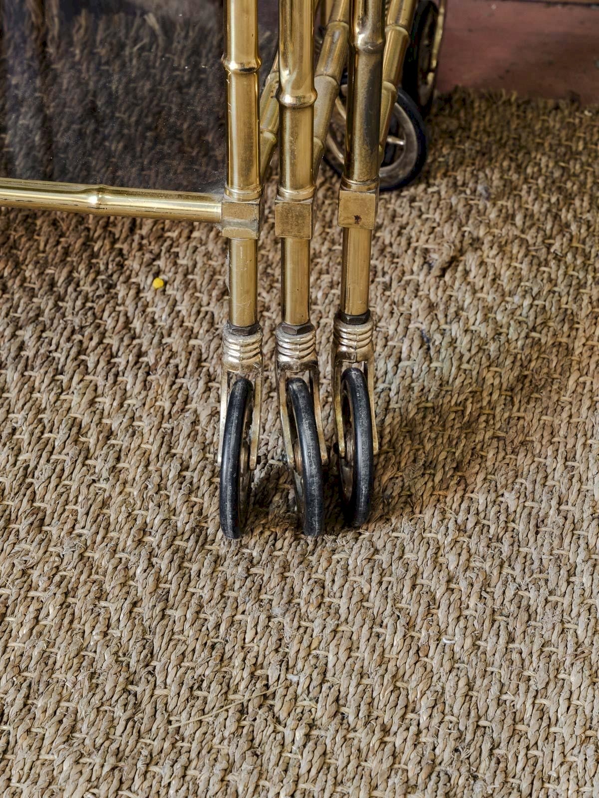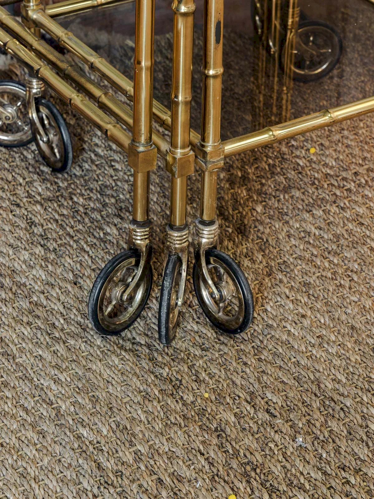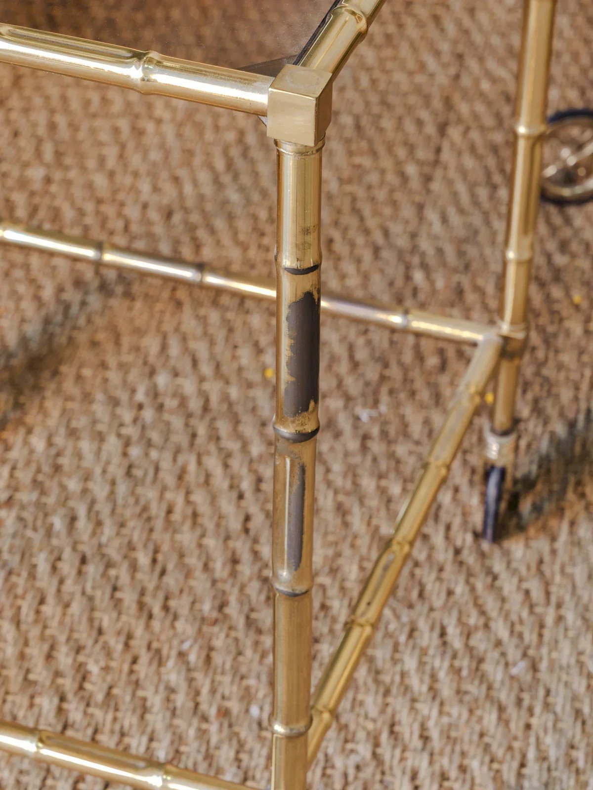 Apportez une touche raffinée à votre salon avec ce trio de tables gigognes en laiton doré et verre fumé, qui combine élégance et praticité. Assemblées sur roulettes, elles se déplacent facilement pour servir d'appoint, de bout de canapé ou comme plateau occasionnel, leur proportion variée permettant un usage modulable selon l'espace. Le verre fumé nuance la lumière et le laiton patiné réchauffe l'ambiance, créant une atmosphère feutrée et contemporaine. Quelques traces du temps présentes. Dimensions de la grande : Longueur : 43 cm Largeur : 43 cm Hauteur : 57 cm Dimensions de la moyenne : Longueur : 38 cm Largeur : 38 cm Hauteur : 54 cm Dimensions de la petite : Longueur : 33 cm Largeur : 33 cm Hauteur : 50 cm État:Occasion: Objet ayant été utilisé. Objet présentant quelques marques d'usure superficielle, ...Occasion: Objet ayant été utilisé. Objet présentant quelques marques d'usure superficielle, entièrement opérationnel et fonctionnant correctement. Il peut s'agir d'un modèle de démonstration ou d'un objet retourné en magasin après une courte période d'utilisation. les éventuelles imperfections. Marque:Debongout Type:Produit chiné Matériau:Laiton, Verre Style:Contemporain Personnalisé:Tables gigognes