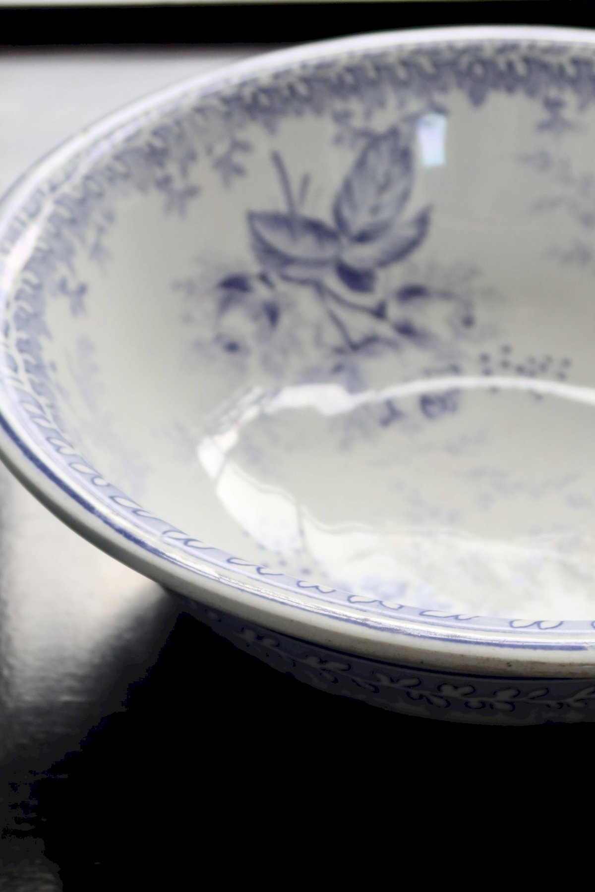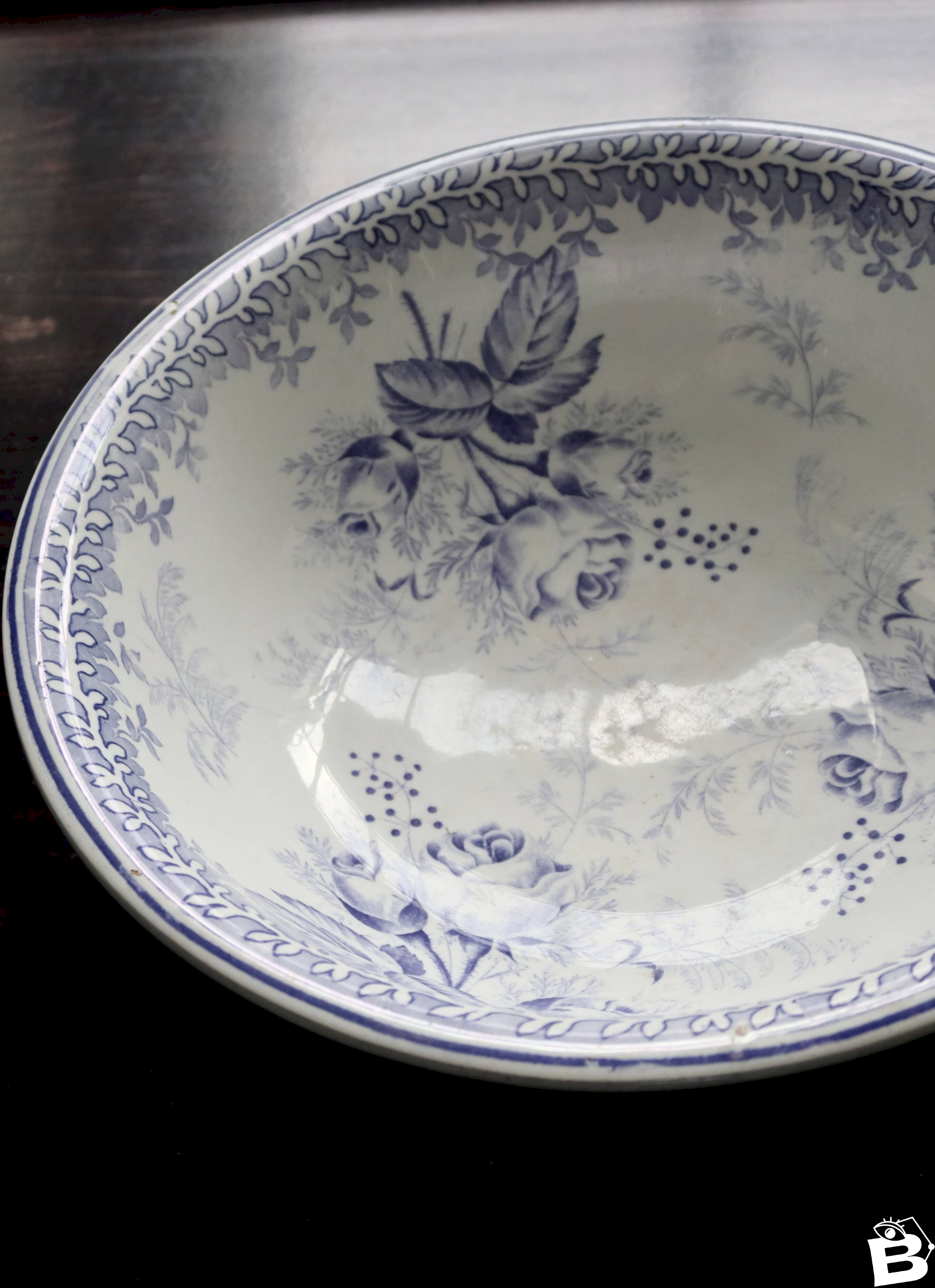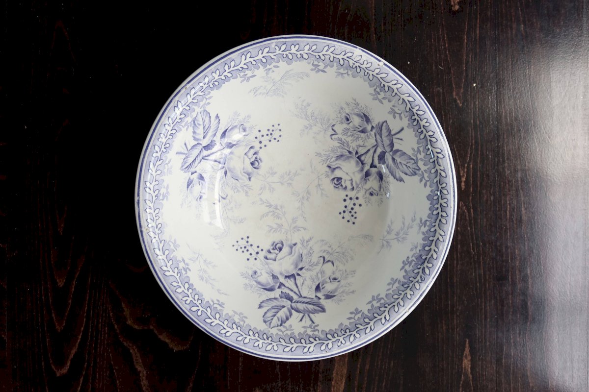 Bassine ancienne en faïence blanche décorée de motifs floraux violets, typiques de la vaisselle et de la toilette d’autrefois.