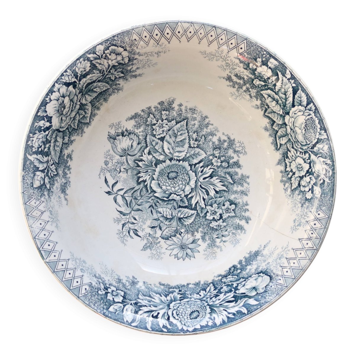 Grande bassine ancienne en terre de fer de la faïencerie Hamage Nord, décor Jardinière bleu à motif floral central et frise géométrique.