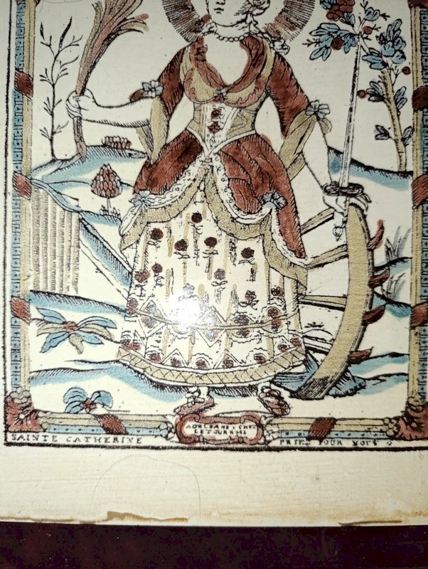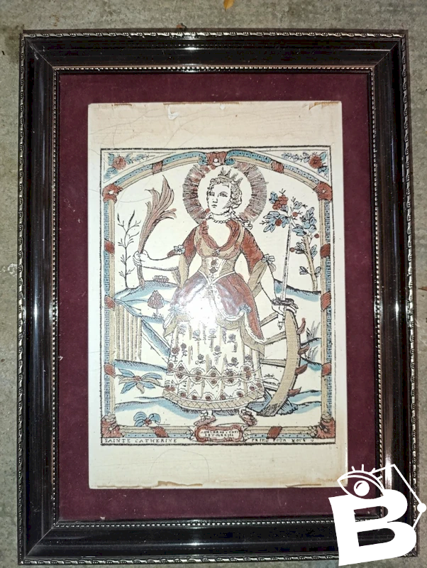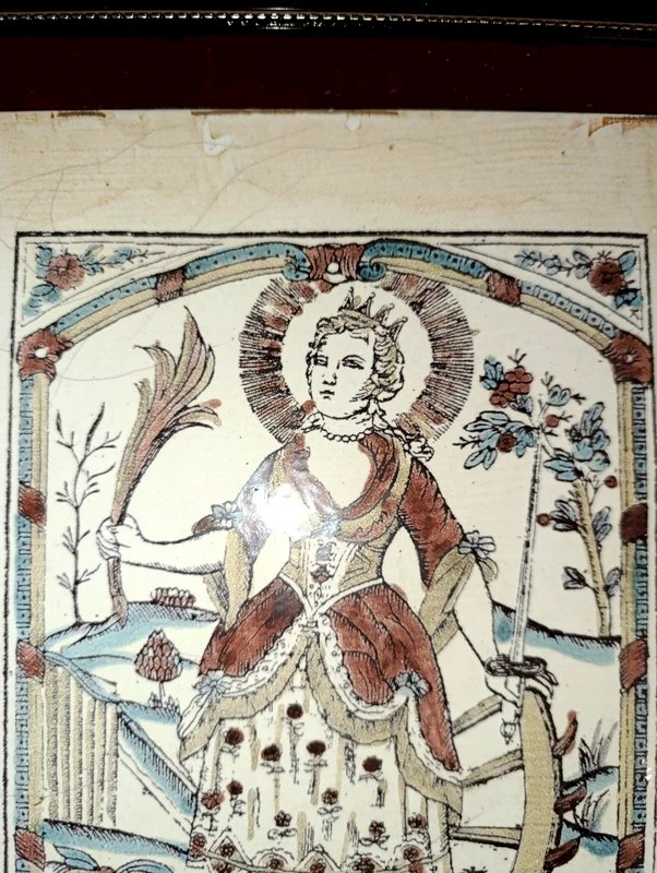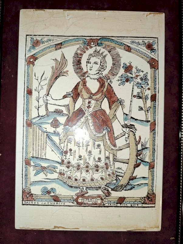 beau cadre avec plaque en ceramique villeroy et boch decor sainte catherine en bon etat petits veinage du cadre sans doute d'origine dimension 39.5X29.5cm du cadre et 30X20cm de la plaque
