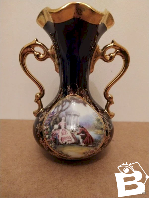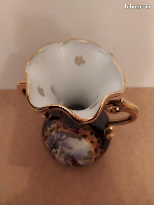 Beau Vase Ancien Limoges Imports Veritable Bleu De Four en bon état Jolie décor et dorure Hauteur 21cm