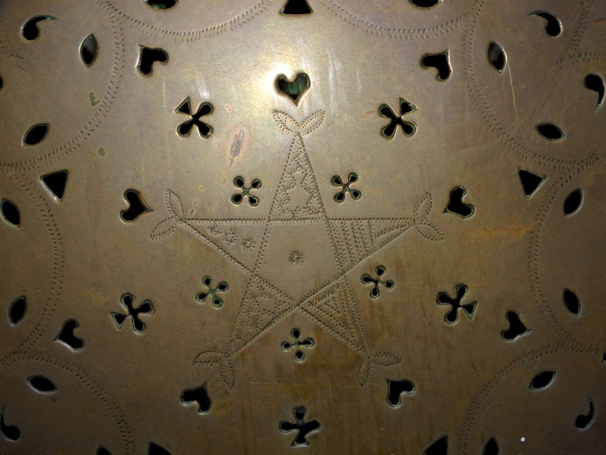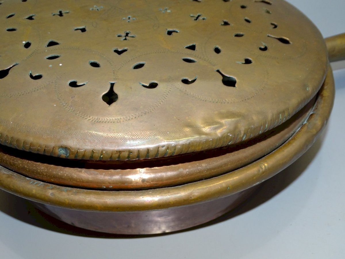 Belle ancienne bassinoire en cuivre à décor de coeurs et autres formes géométriques - une étoile gravée au centre - présence de petits chocs d'usage sur le côté - avec traces anciennes de produit de nettoyage à l'intérieur ( voir photos ) - Jus de trouvailles - sortie de grenier - en état d'usage, à nettoyer - Réf. 42141025/119 - Hauteur 76 cm - Diamètre 30 cm - Epaisseur 10,5 cm - Poids 2,340 kg - Pour me contacter mon adresse mail : EXPEDITION en Mondial Relay OU Colissimo possible sur demande EMBALLAGE GARANTI très protecteur MERCI de BIEN REGARDER TOUTES les PHOTOS car ELLES FONT PARTIE INTEGRANTE de la DESCRIPTION et PERMETTENT de VOIR l'OBJET AU MIEUX - Type:Objet de vitrine, Décoratif Origine:France Sous-type:BASSINOIRE CUIVRE Matière:Cuivre