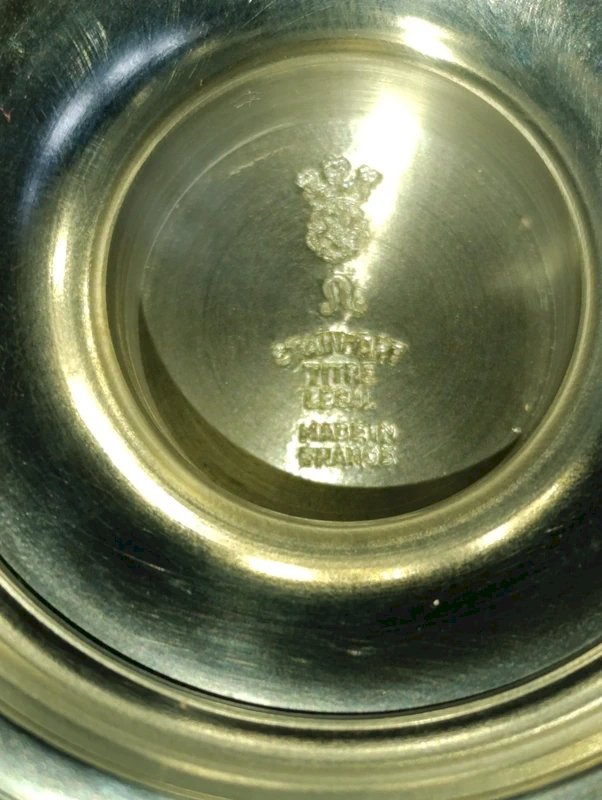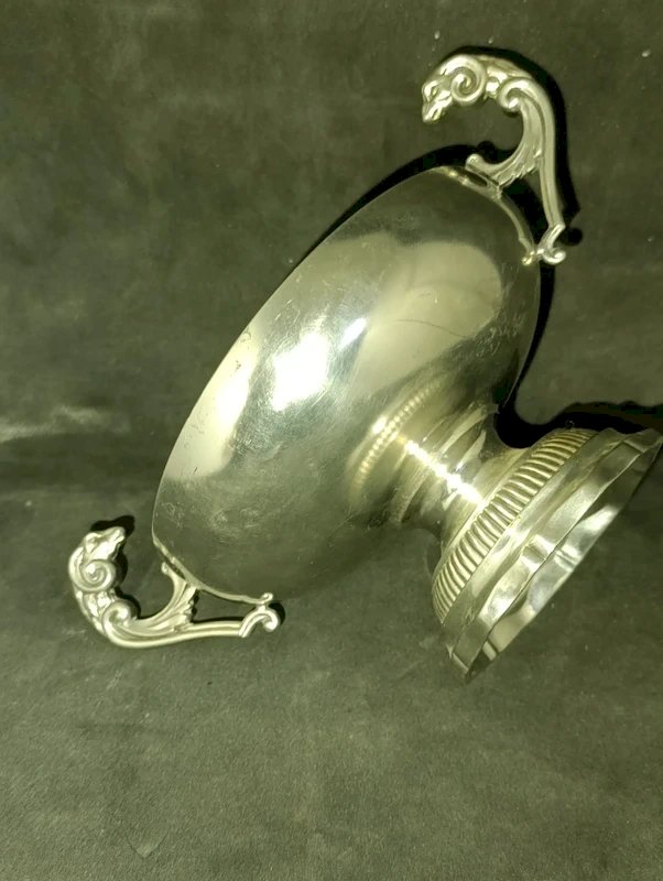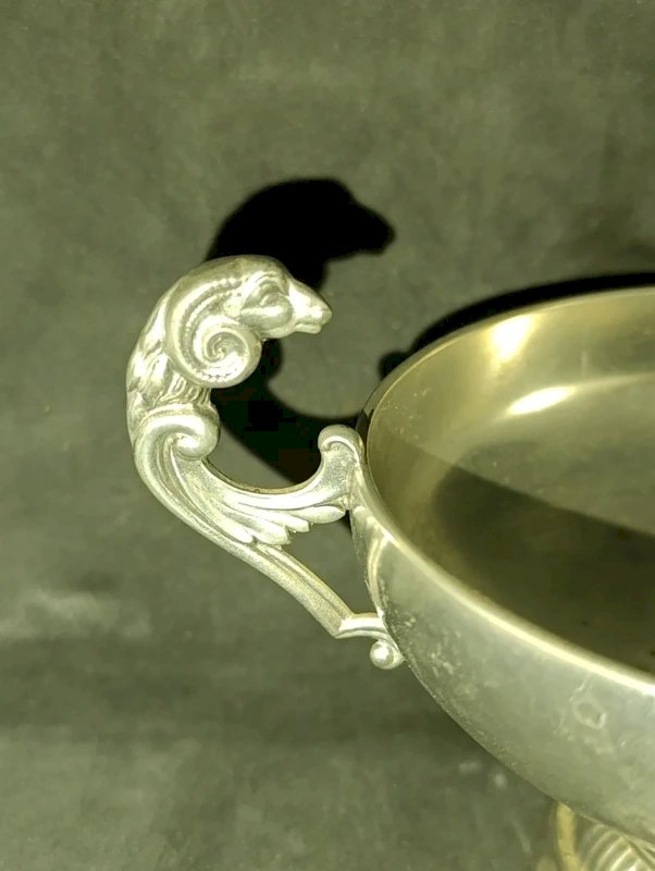 belle coupe bourguignonne ancienne en etain anse decor belier en bon etat poinçons sous la base quelques marques d'usures et de frottements d'usages (voir photos) dimension 19cm avec anse, diametre 12.5cm hauteur 10cm