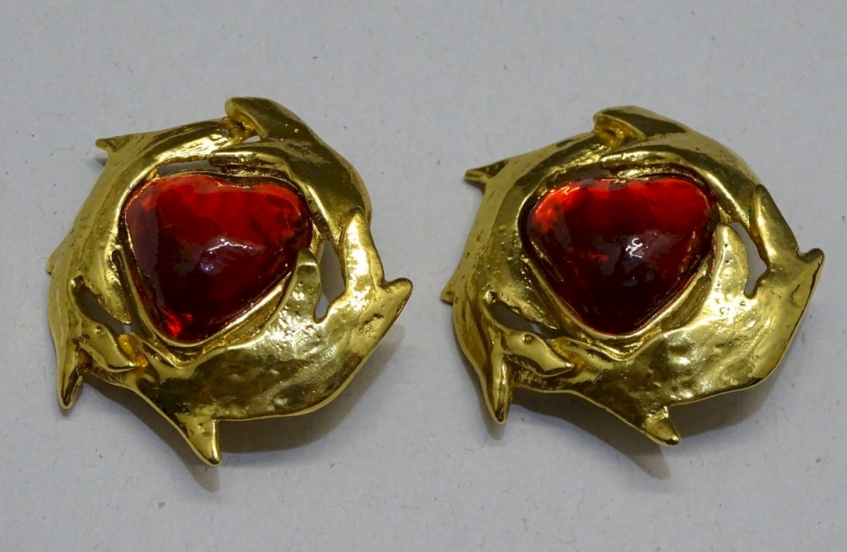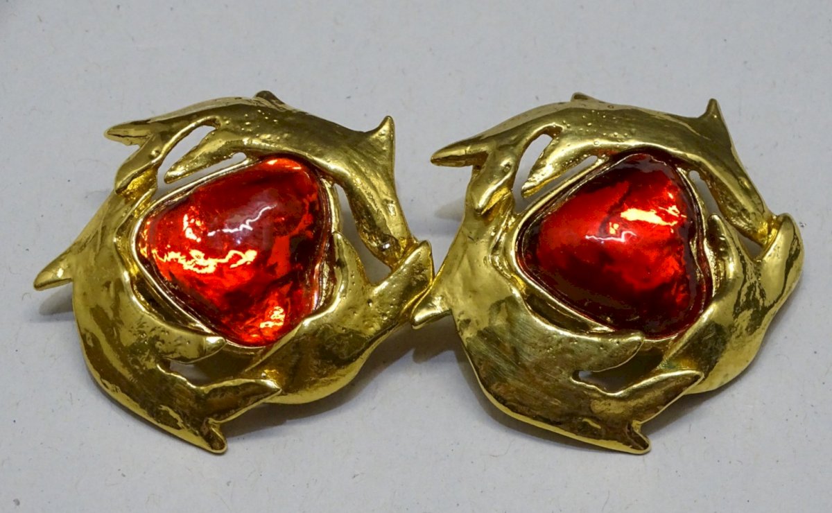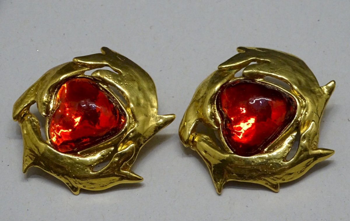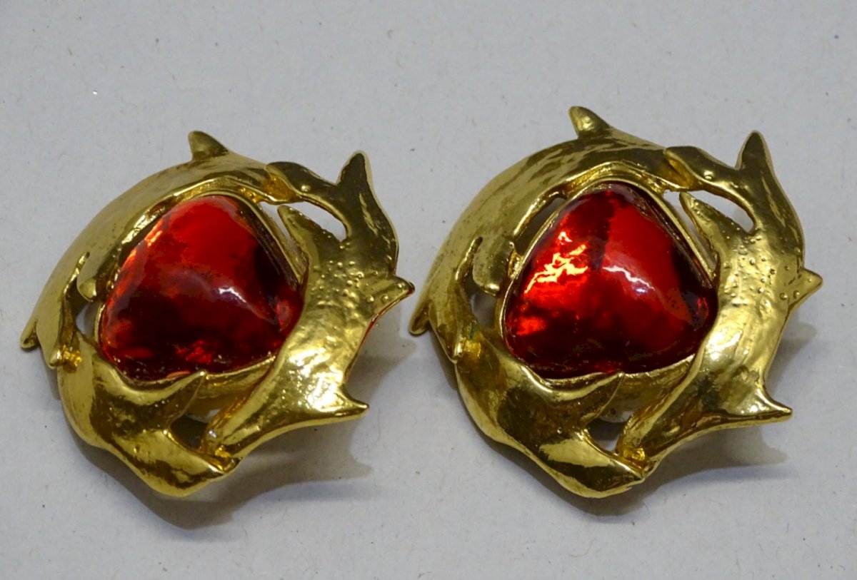 belle paire de boucles d'oreilles clips Yves Saint Laurent - couleur rouge et or - les petits tampons caoutchouc ont des traces d'usage -  (photos) - pur jus de trouvailles -  Réf. 1V250703/143 + ou -  3,97 x 4 cm - poids 32 g   Pour me contacter mon adresse mail : EXPEDITION POSSIBLE EN MONDIAL RELAY ou COLISSIMO sur demande TRES BON EMBALLAGE GARANTI     MERCI de BIEN REGARDER TOUTES les PHOTOS car ELLES FONT PARTIE INTEGRANTE de la DESCRIPTION et PERMETTENT de VOIR l'OBJET AU MIEUX  avec SES PETITS DEFAUTS EVENTUELS - État:Occasion: Objet ayant été porté. ...Occasion: Objet ayant été porté. les éventuelles imperfections. Fermoir:Clips