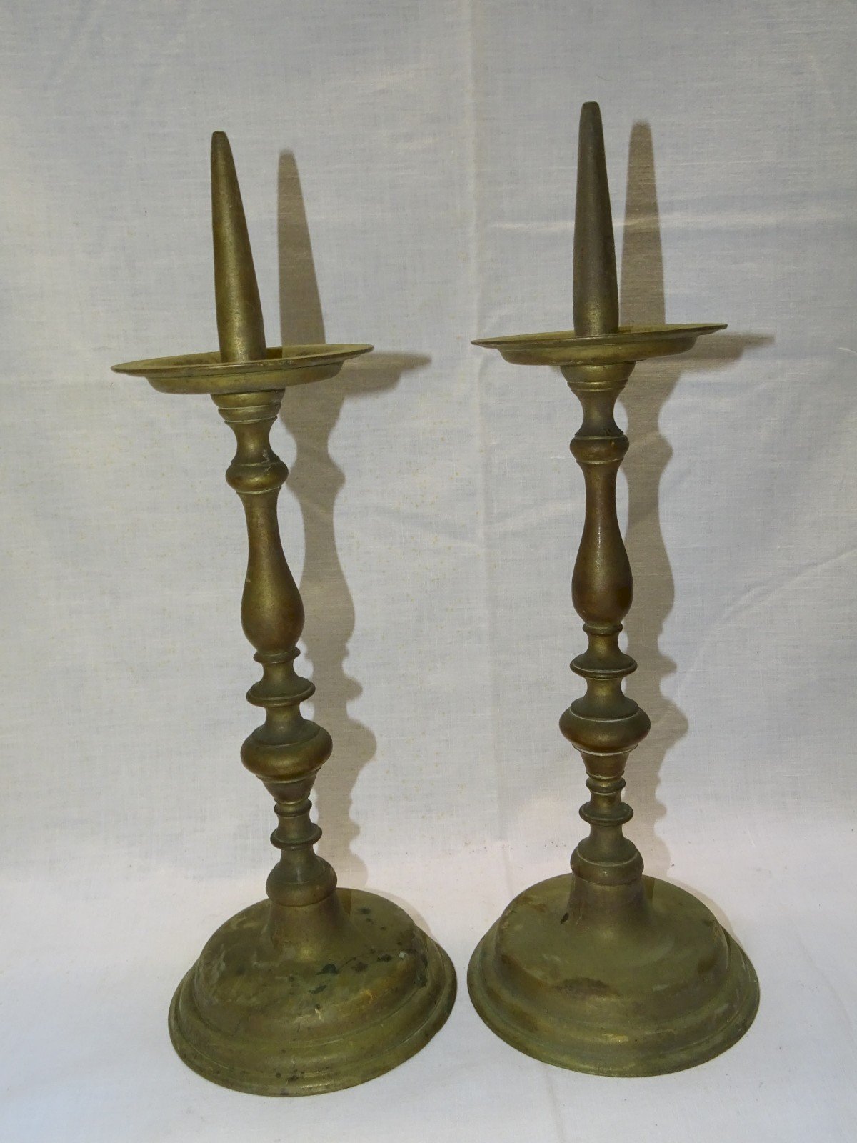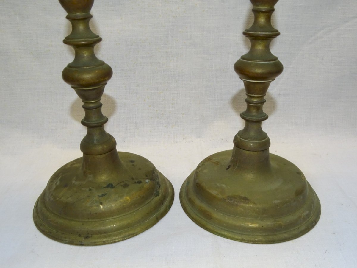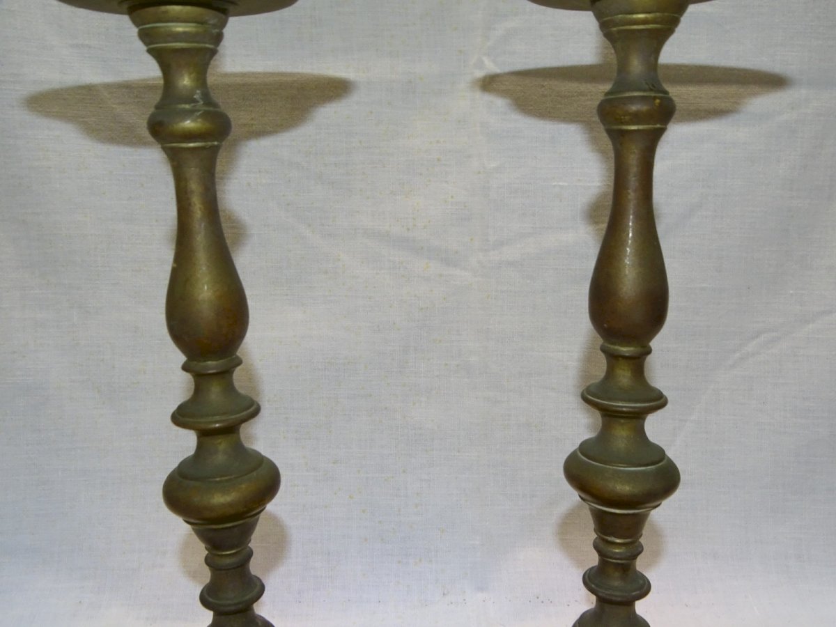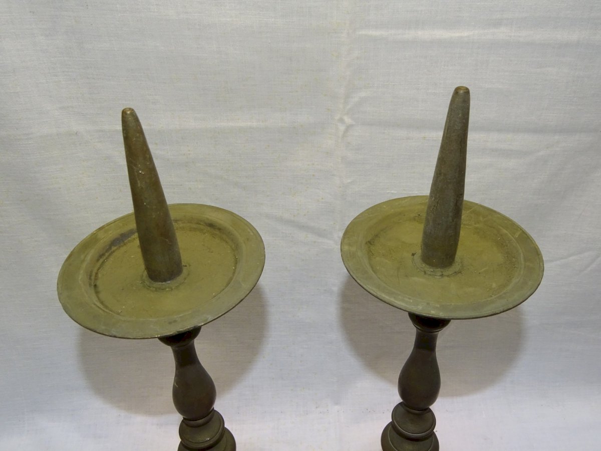 Belle paire de pique cierges Bronze XVIIIe - un a une petite usure sur le bord de la coupelle - jus de grenier, non nettoyés, avec patine ancienne, en bon état d'usage (voir photos) - Réf. 1V240216/226 - Hauteur 36,4 cm - Diamètre pied 12,9 cm - Poids 2,975 kg - Pour me contacter mon adresse mail : EXPEDITION POSSIBLE EN MONDIAL RELAY ou COLISSIMO sur demande TRES BON EMBALLAGE GARANTI MERCI de BIEN REGARDER TOUTES les PHOTOS car ELLES FONT PARTIE INTEGRANTE de la DESCRIPTION et PERMETTENT de VOIR l'OBJET AU MIEUX avec SES PETITS DEFAUTS EVENTUELS - Matière:Bronze