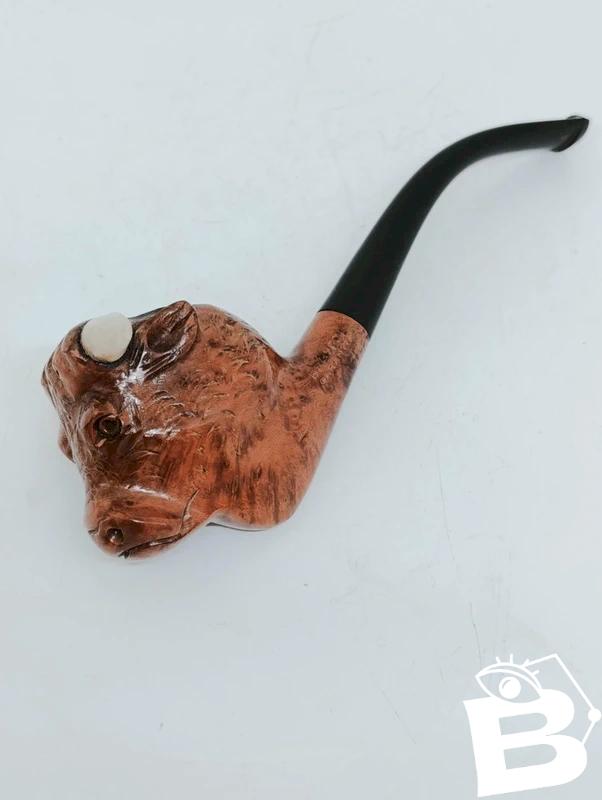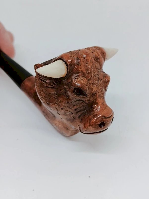 belle pipe en bois sculptée tête de taureau bruyère garantie st claude en bon etat Marron