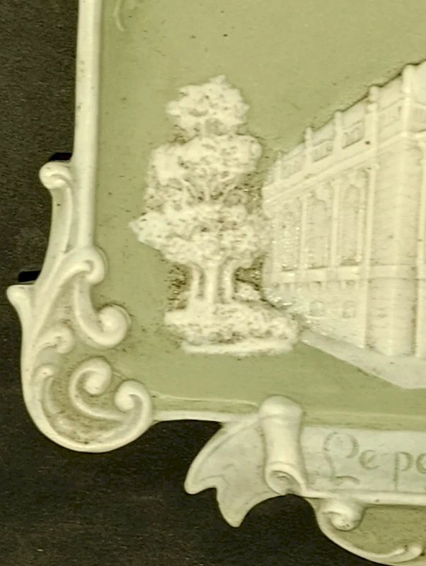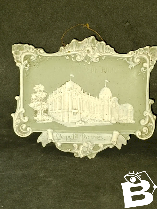 belle plaque /vide poche en biscuit style wedgwood vers 1900 en bon etat porte l'inscription "le petit palais" ainsi qu une inscription exposition universelle de 1900 dimension 16x14cm petites usures normales et petit nettoyage pour retrouver une couleur parfaite rare