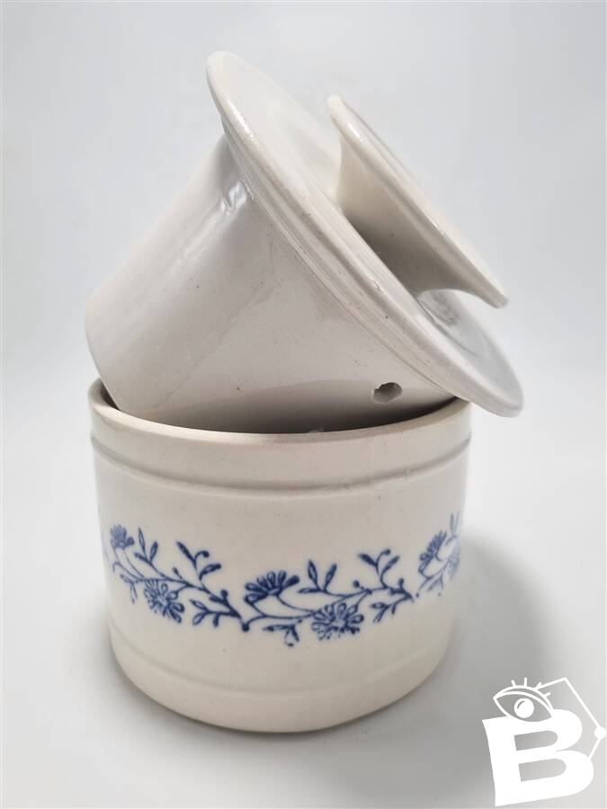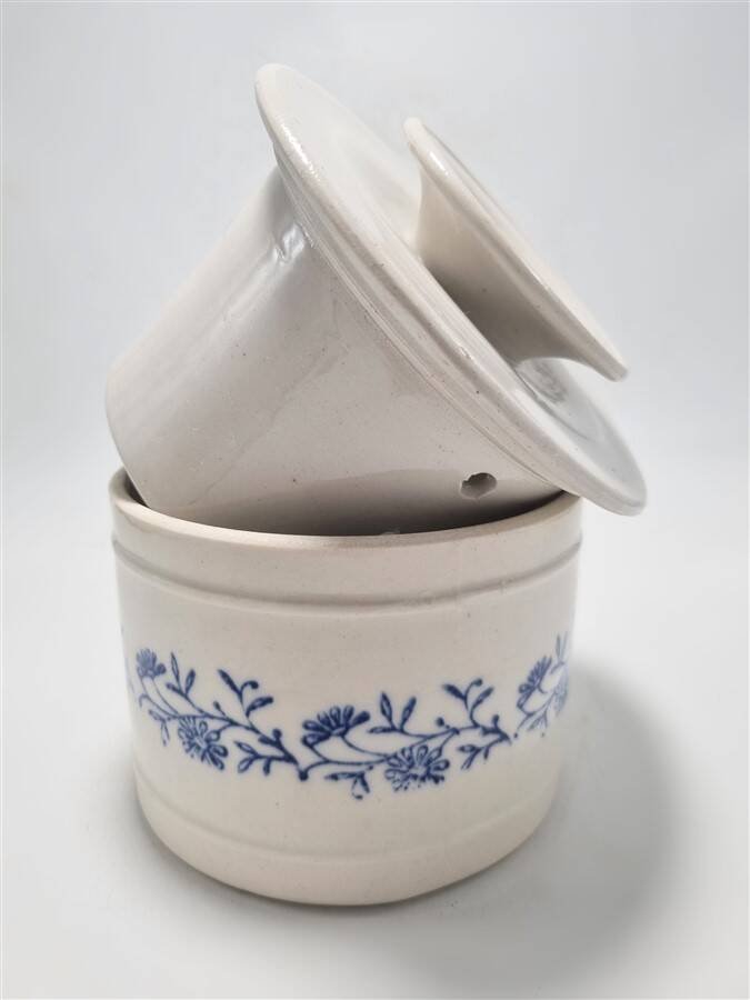 Beurrier à eau grande taille.Un beurrier à eau permet la conservation du beurre en le mettant à l’abri de l’air.Il faut mettre de l’eau au fond du pot et déposer le beurre dans la partie supérieure.Ainsi, le beurre se conserve longtemps hors du frigo et reste tendre.Diamètre du pot: 13 cm.Diamètres du couvercle: 14.5 et 10.5 cm.Hauteur: 12 cm.Poids: 1.200 kg environ.