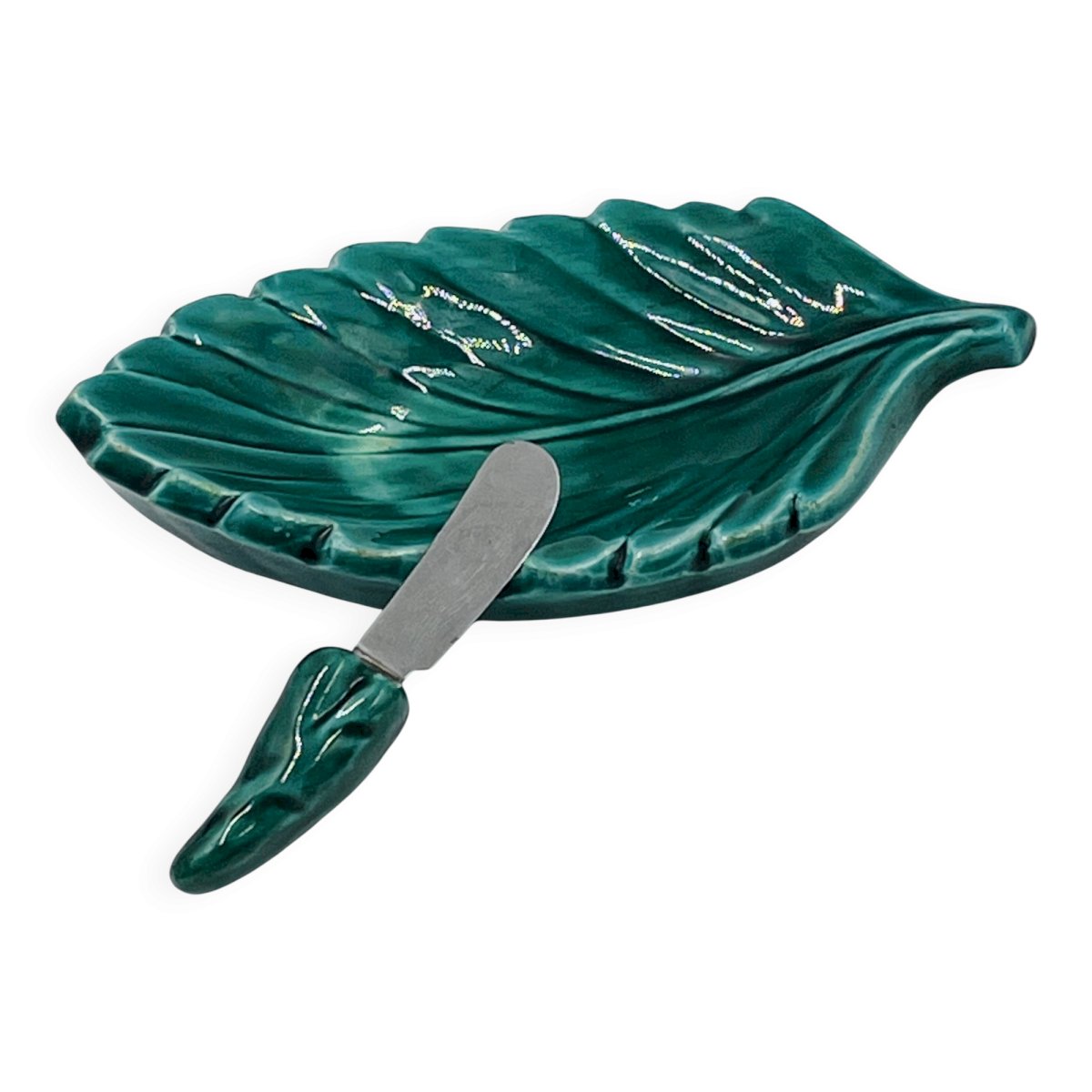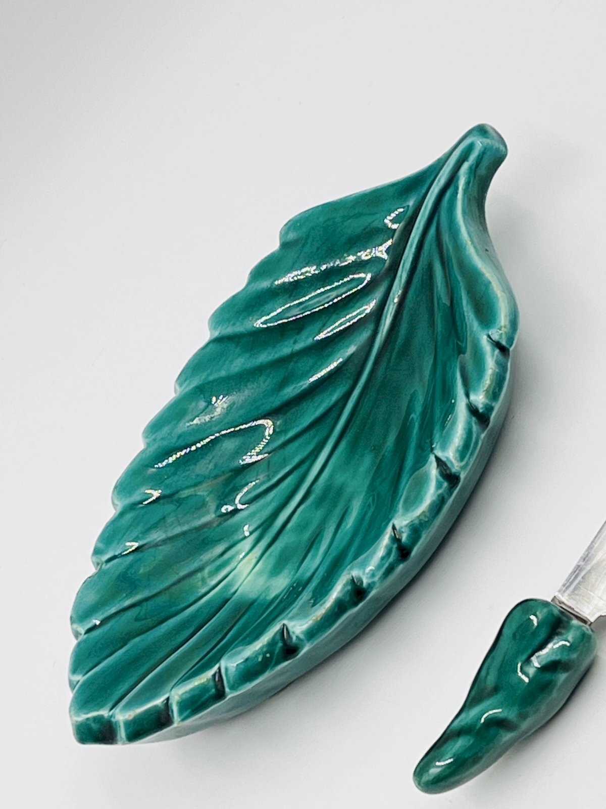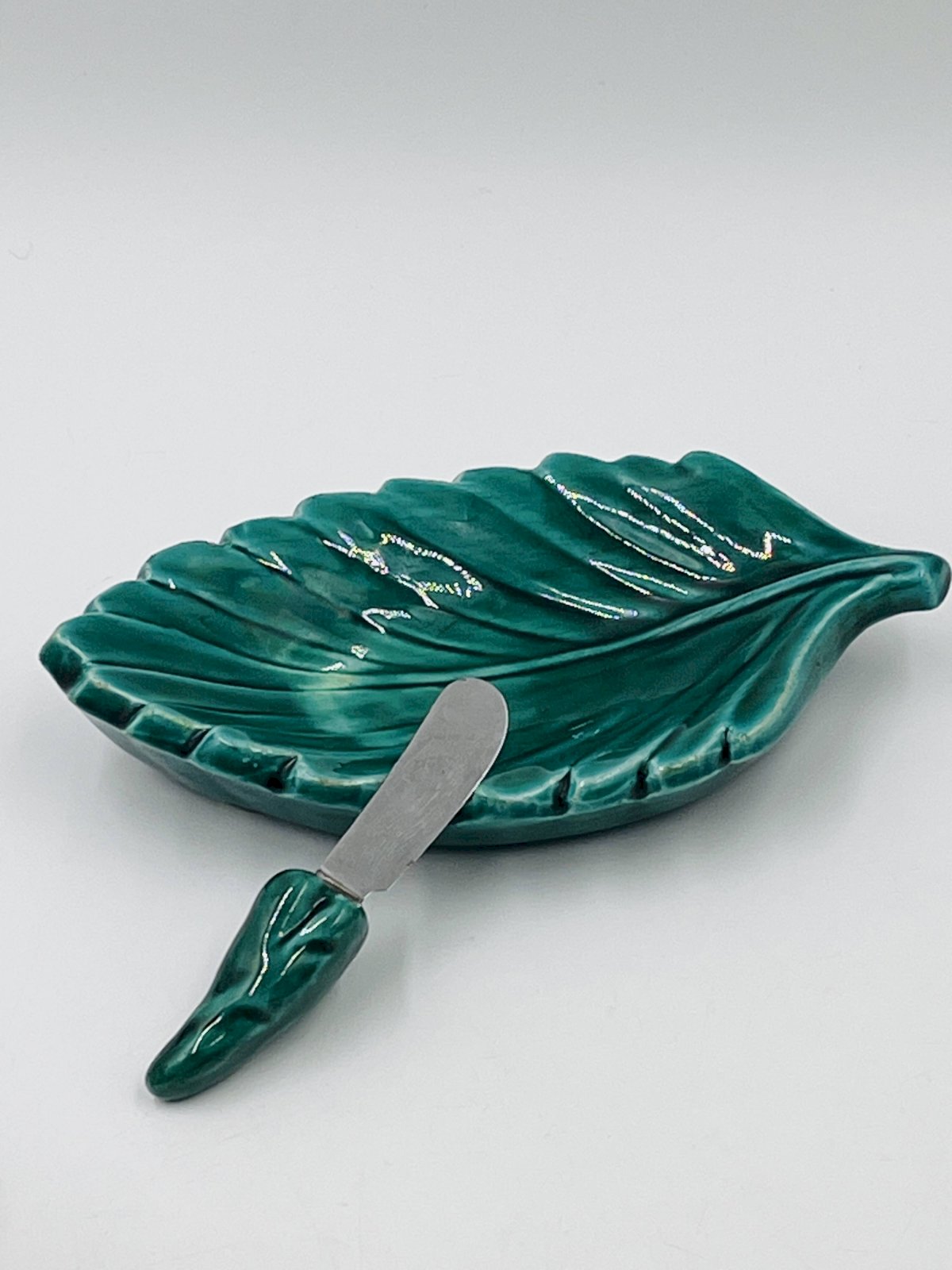 Ce beurrier en céramique, délicatement façonné en forme de feuille, arbore une teinte verte éclatante qui évoque la fraîcheur et la nature.
