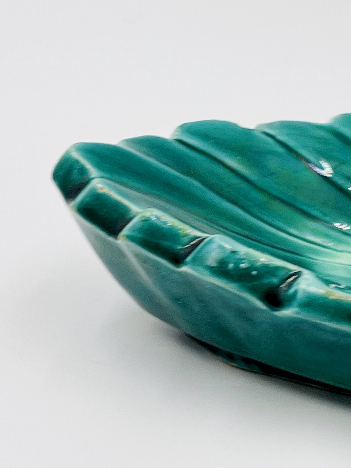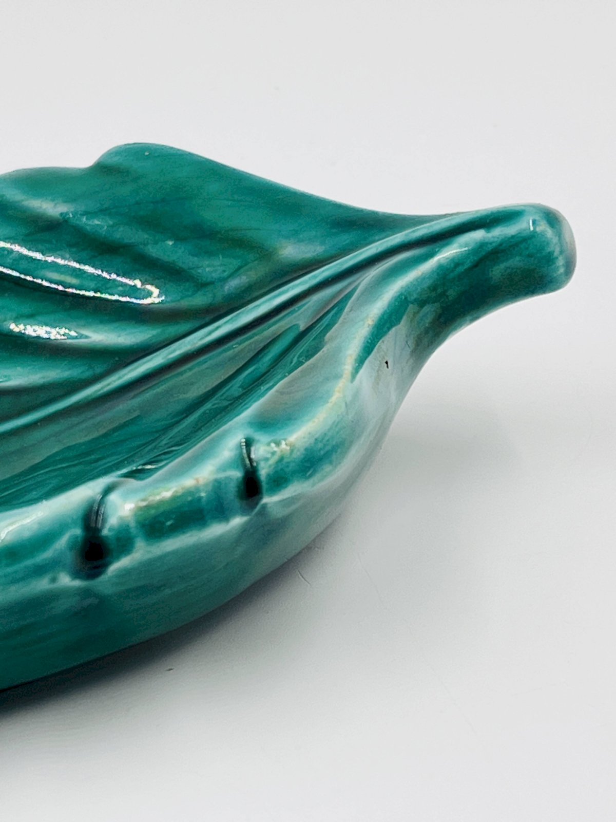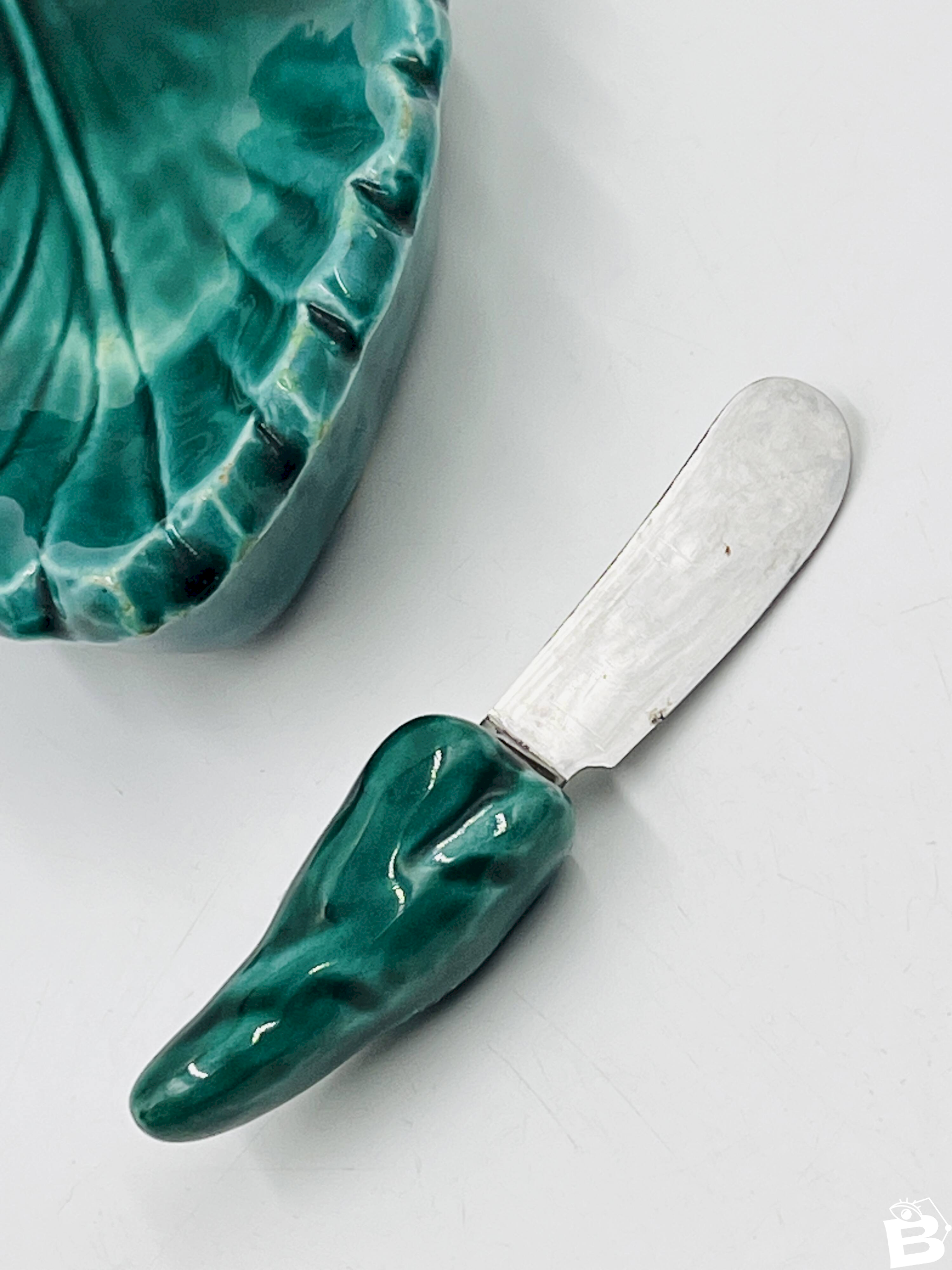 Ce beurrier en céramique, délicatement façonné en forme de feuille, arbore une teinte verte éclatante qui évoque la fraîcheur et la nature.
