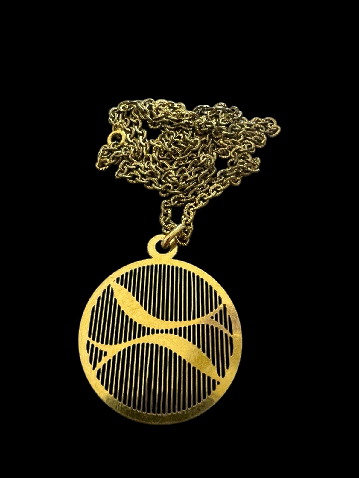 Bijou ancien collier vintage Jacques Esterel Pendentif poisson Design Collector. Superbe collier vintage Jacques Estérel, non signé, comme l’était, la plupart du temps ses bijoux très représentatif du style français des années 70. La chaîne (type maille classique) mesure environ 48 cm, le pendentif rond de 4 cm de diamètre, en métal doré. Le motif présente deux poissons stylisés, pouvant évoquer le signe astrologique du Poisson ou un motif décoratif aquatique/ornemental. Le bijou est en bon état, avec la patine normale du métal dû au temps, mais sans dommages majeurs (rayures, usure visible sur les photos). Idéal pour collectionneurs de bijoux vintage ou amateurs de motifs astrologiques / symboliques. Détails Matière : métal doré (plaqué or ou dorure, selon état) Longueur : 48 cm Diamètre du pendentif : 4 cm Pays : France Période estimée : années 70 État:Occasion: Objet ayant été porté. ...Occasion: Objet ayant été porté. les éventuelles imperfections. Pierre dominante:Aucune Pierre, Aucune Marque:Jacques, Esterel Type:Collier avec pendentif Pays de fabrication:France Couleur dominante:Doré Matière:Non Thème:Designer