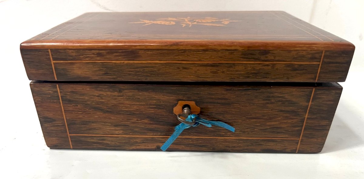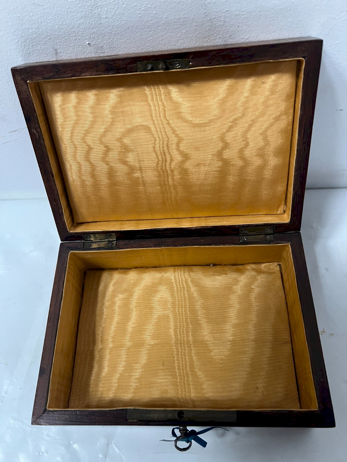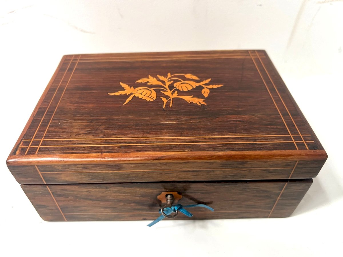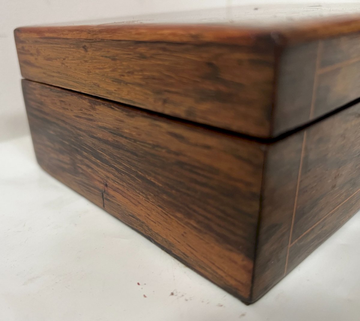 Boite a bijoux Napoléon III en palissandre  Marqueterie et filet de bois clair sur le dessus  Intérieur en tissus soyeux Bon état  Dimension H 8 x L 19 x 12 cm  Début du XX siècle    Type:Objet de vitrine, Décoratif Origine:France Sous-type:Boîte Pays d'origine:France Hauteur:8 Matière:Bois Style:Napoléon III Longueur:19 Largeur:12