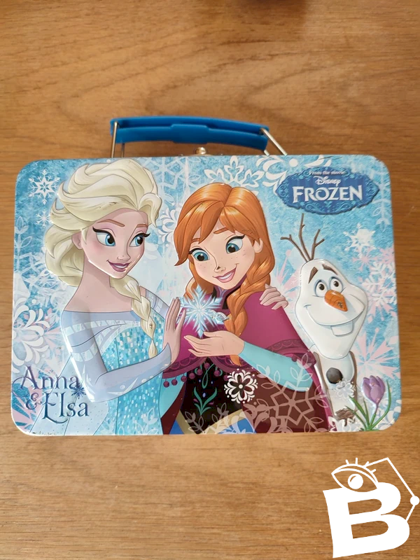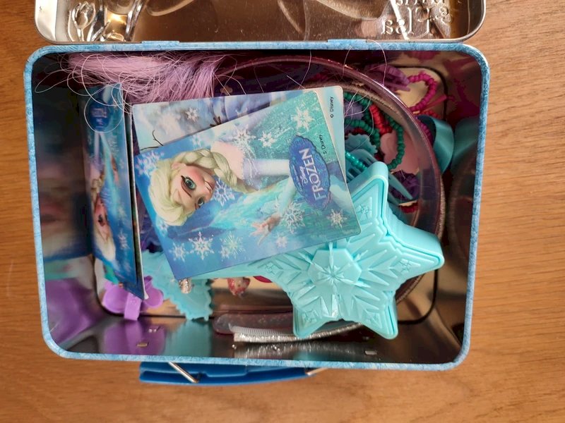 Boite à biscuit reine des neiges avec accessoires divers serre tete, colliers etc bon etat juste deux trois petites marques sur la boite
