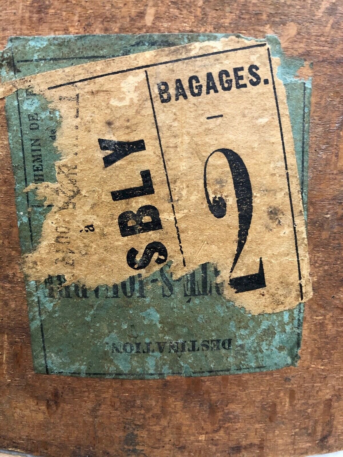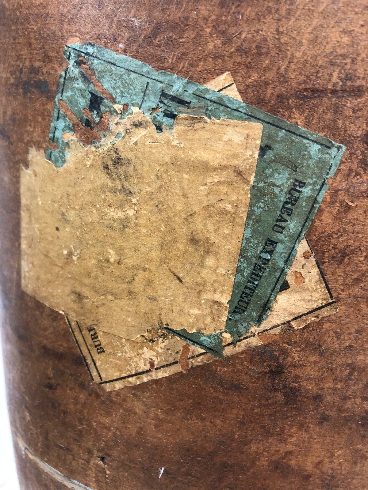 Boîte à chapeau ancienne – bois XIXe – étiquette chemin de fer – publicité