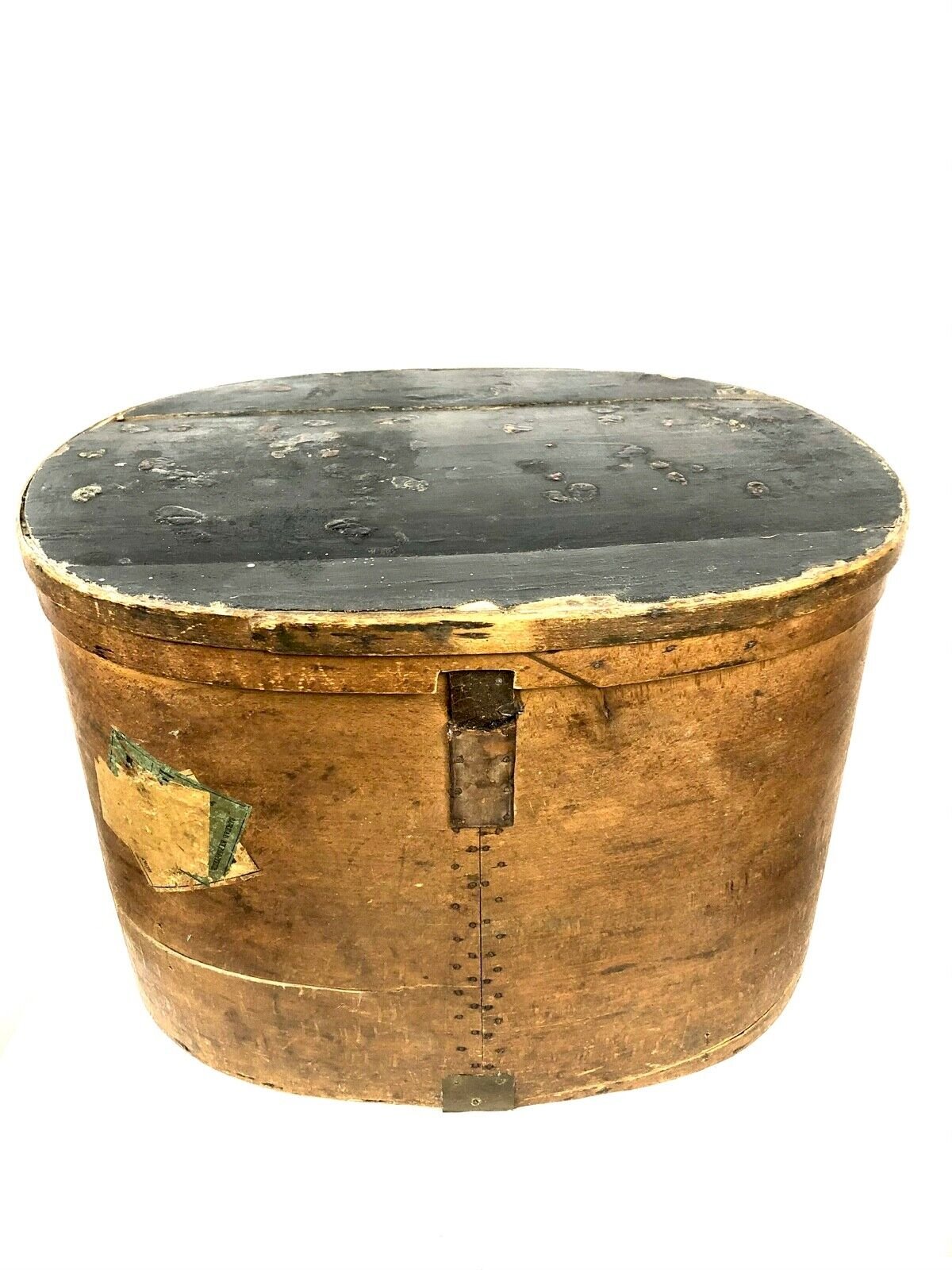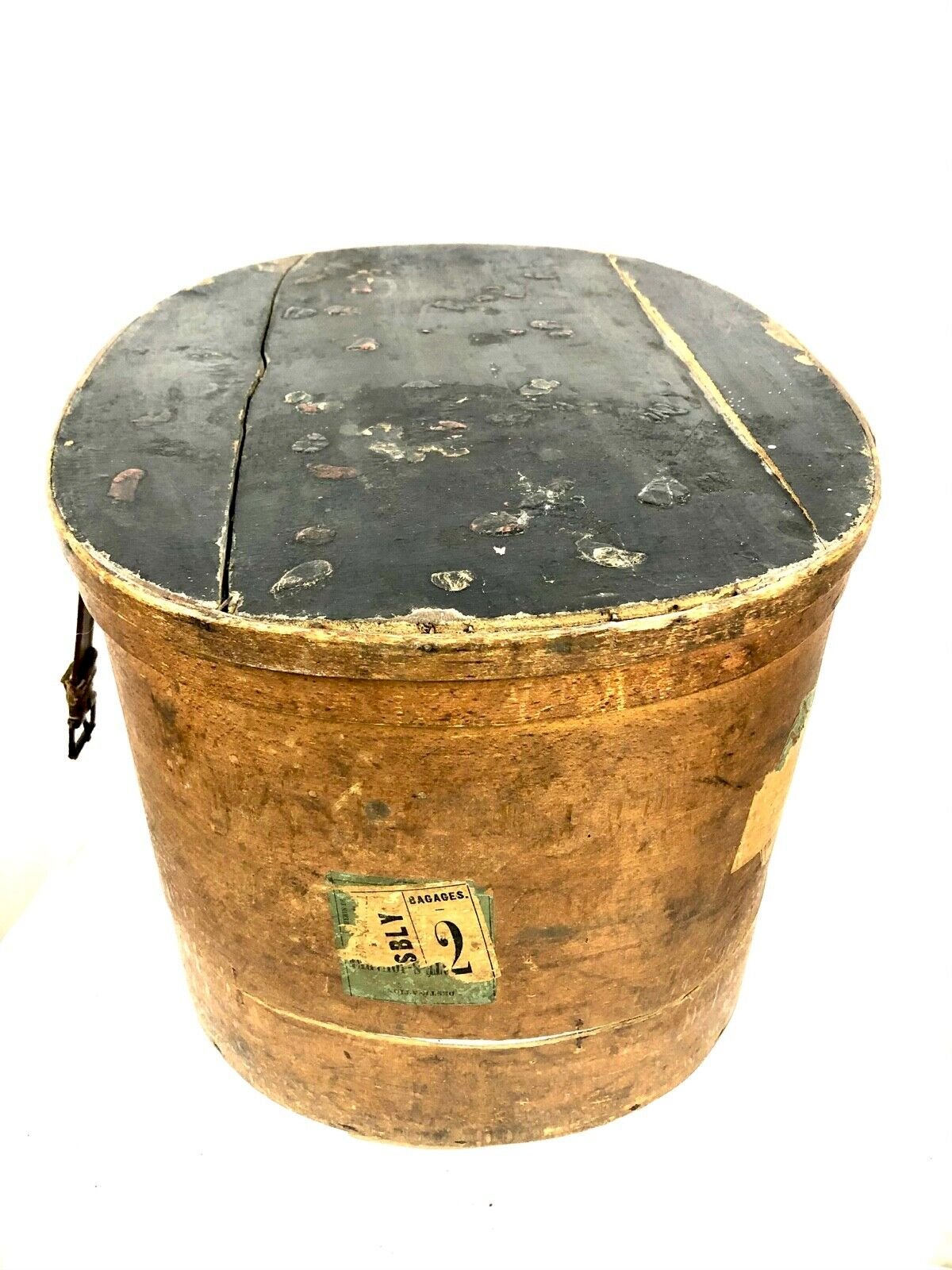 Ancienne boite à chapeau en bois réalisée avec du bois fin. Trace d'étiquette de voyage par le chemin de fer, on peut lire des gares de Seine et Marne d'Esbly, La Ferte Sous Jouarre. Etiquette publicitaire collée dessus sur la marque de dentifrice Dentol. Cette boite est très ancienne et a souffert. Vendu en l'état, trace d'usure. Dimension : Hauteur : 30 cm or 11,81'' largeur : 42cm x 34cm ou 16,53'' x 13,38'' Très joli élément pour votre décoration intérieur. Authenticité:Original Type:Hat box Origine:France Sous-type:Boîte Pays d'origine:France Style:Publicité / Art populaire Matière:Bois