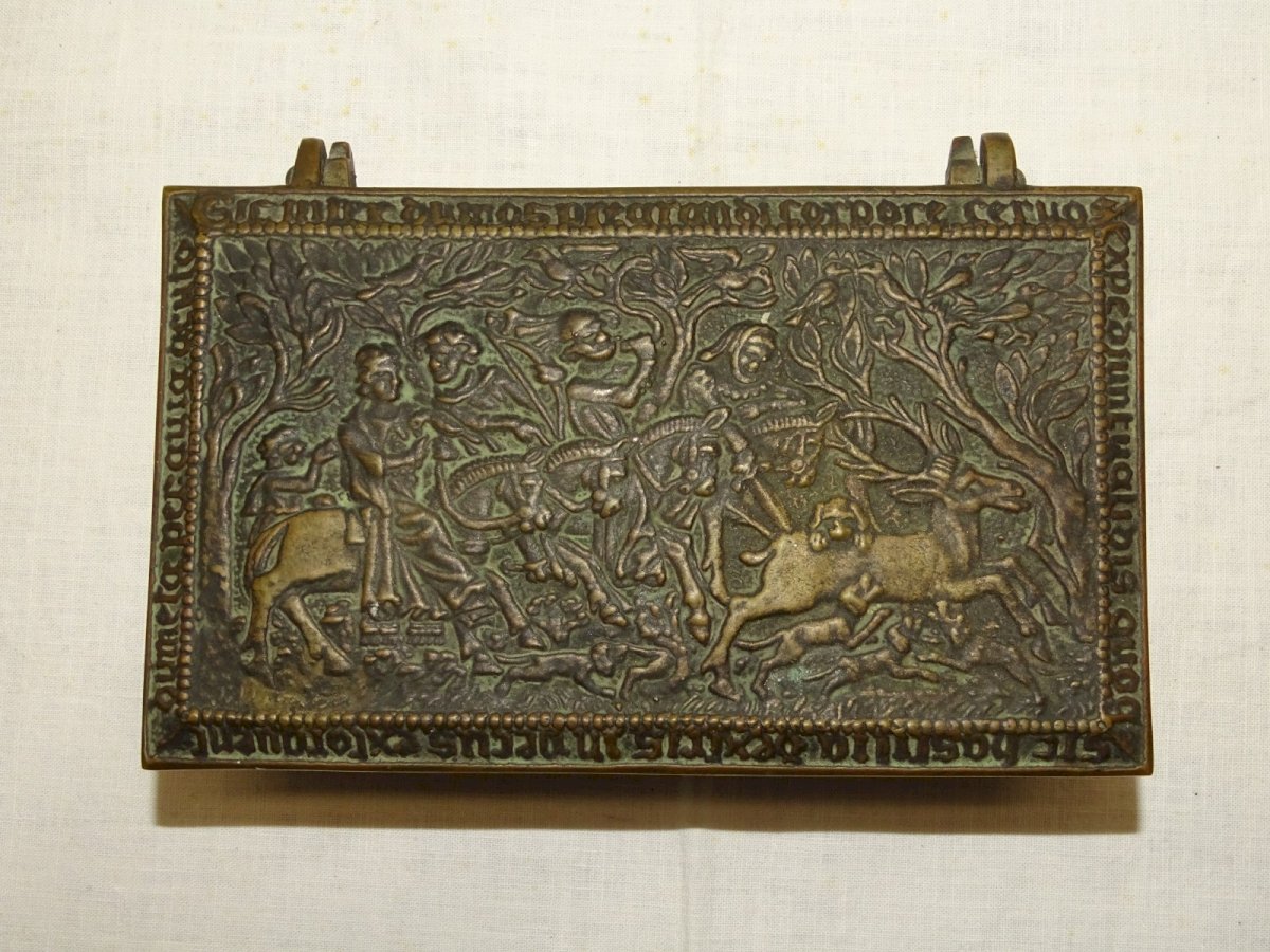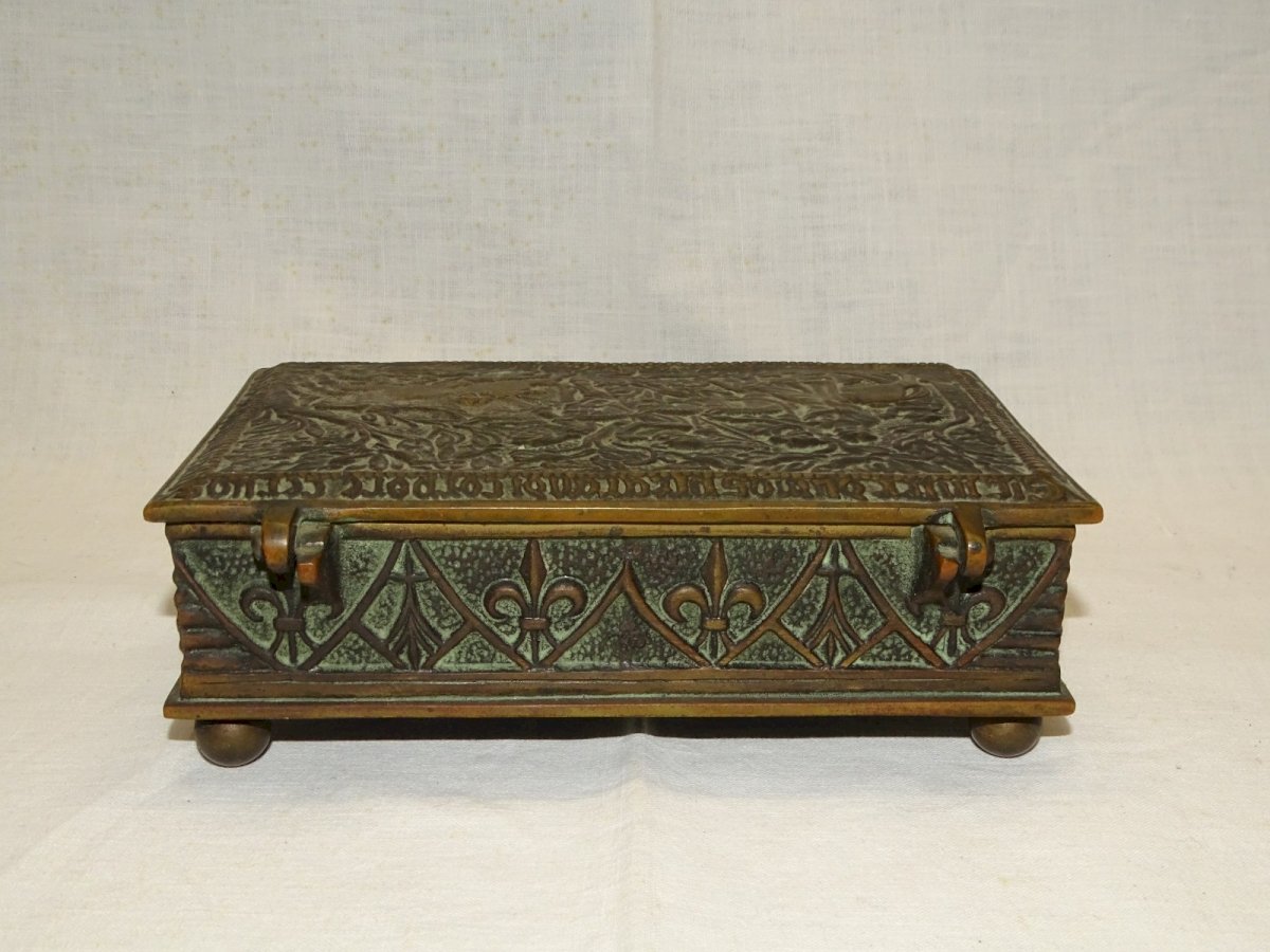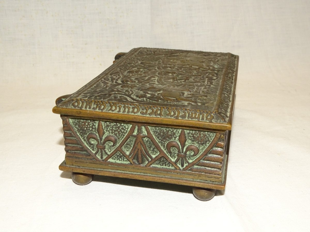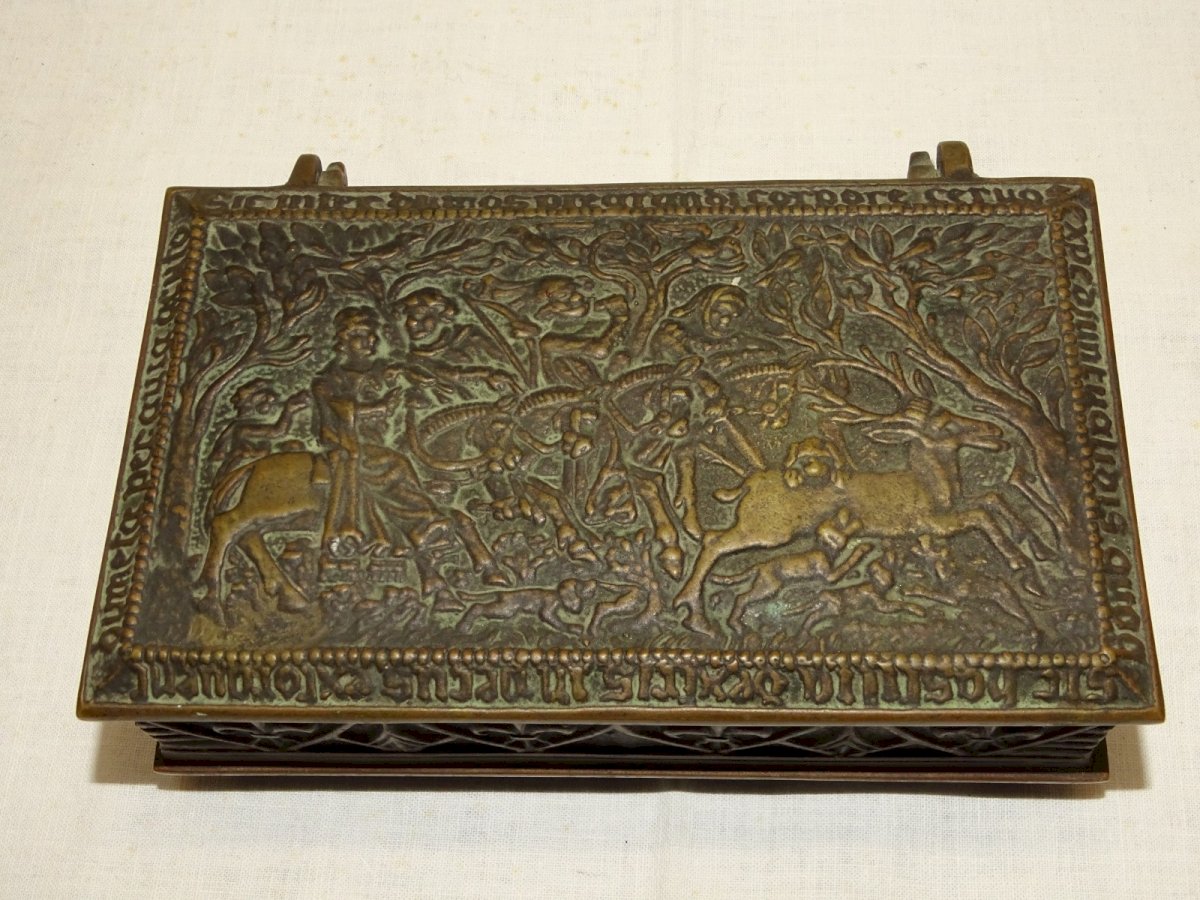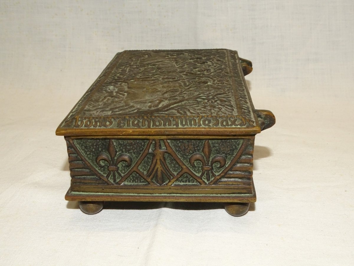 - BOITE BRONZE Signée MAX LE VERRIER SCENE DE CHASSE AU CERF AU MOYEN AGE D