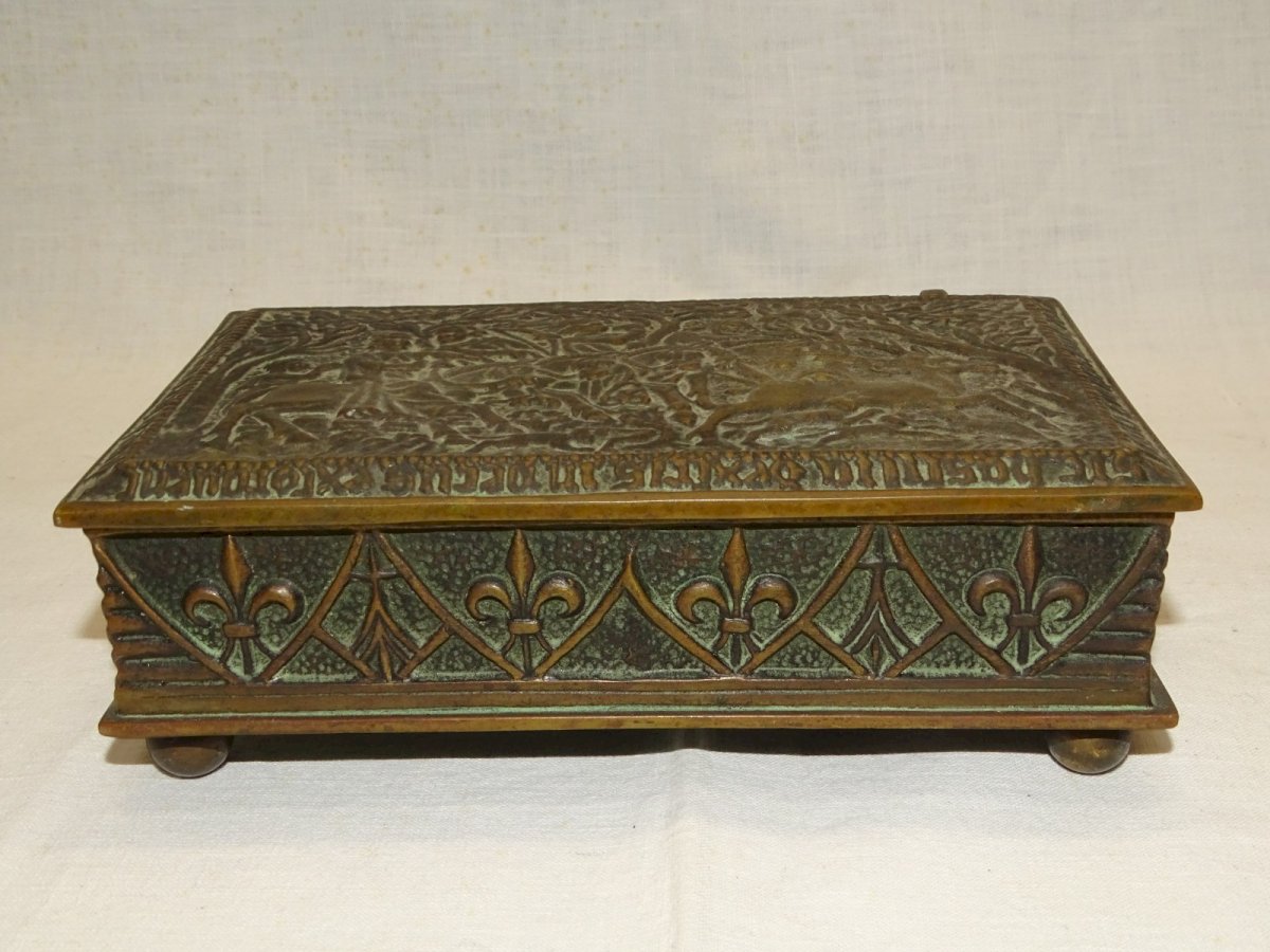 Belle boite coffret Max Le Verrier en bronze scène de chasse au cerf au moyen âge - une guirlande de fleurs de lys tout le tour - présence de tâches et usures tissu intérieur ( photo) - en bon état d'usage (voir photos) - Réf. 1V260319/4 - 16,5 x 10,8 cm Hauteur 5,8 cm - Poids 1,118 kg - Pour me contacter mon adresse mail : EXPEDITION POSSIBLE EN MONDIAL RELAY ou COLISSIMO sur demande TRES BON EMBALLAGE GARANTI MERCI de BIEN REGARDER TOUTES les PHOTOS car ELLES FONT PARTIE INTEGRANTE de la DESCRIPTION et PERMETTENT de VOIR l'OBJET AU MIEUX avec SES PETITS DEFAUTS EVENTUELS -