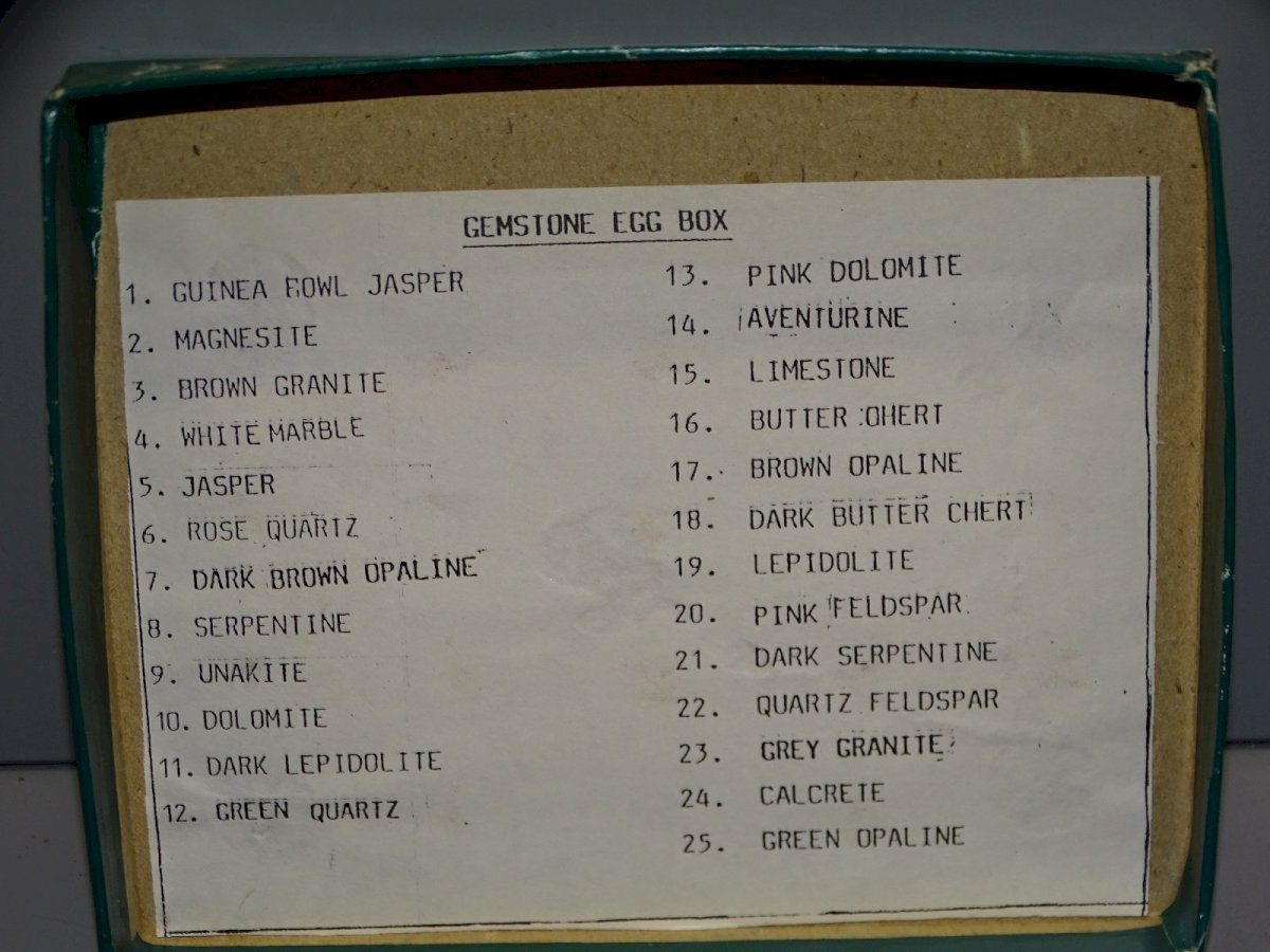 Boite avec 25 oeufs miniatures en différentes pierres - la boite a quelques usures et le support intérieur a également des petites usures  - ( voir photos )  - en bon état d'usage, jus de grenier -  Réf. : 1V240718/398 - Boite 14,5 x 11,7 cm - Oeufs + ou - 2,55 x 2,05 cm -  Poids 0,434 kg      EXPEDITION POSSIBLE EN MONDIAL RELAY ou COLISSIMO sur demande TRES BON EMBALLAGE GARANTI  MERCI de BIEN REGARDER TOUTES les PHOTOS car ELLES FONT PARTIE INTEGRANTE de la DESCRIPTION et PERMETTENT de VOIR l'OBJET AU MIEUX  avec SES PETITS DEFAUTS EVENTUELS -
