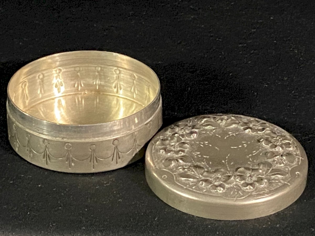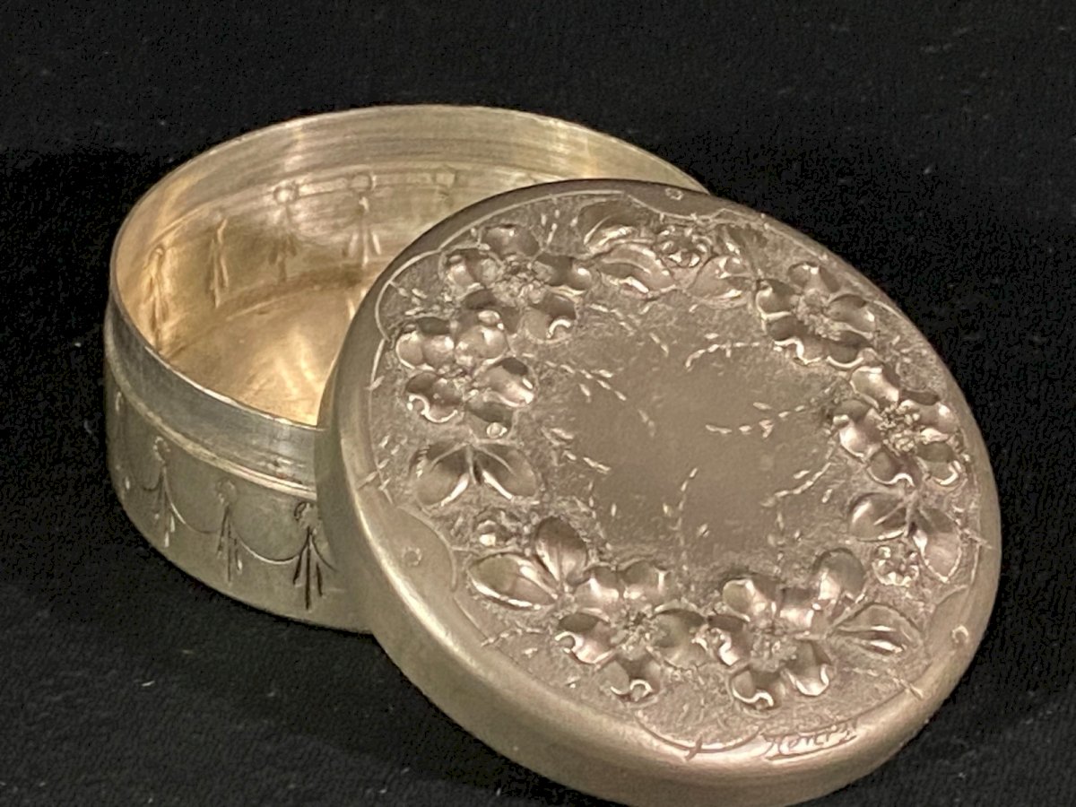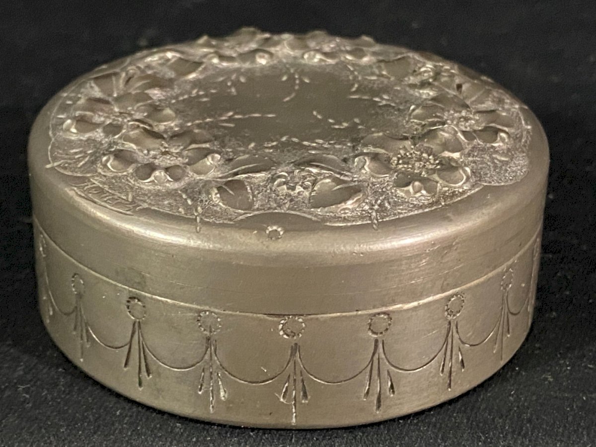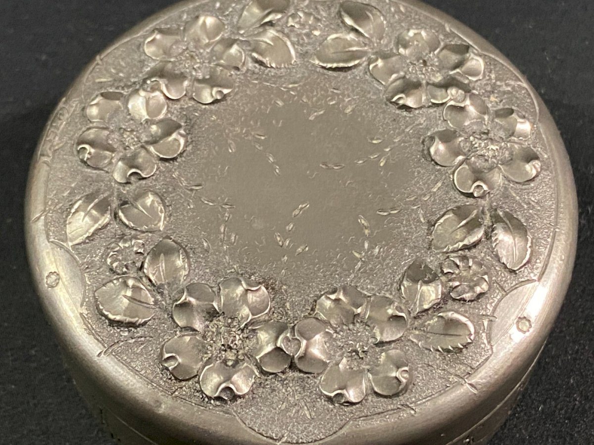 Boite couverte circulaire signée en étain à décor floral en relief début XXe