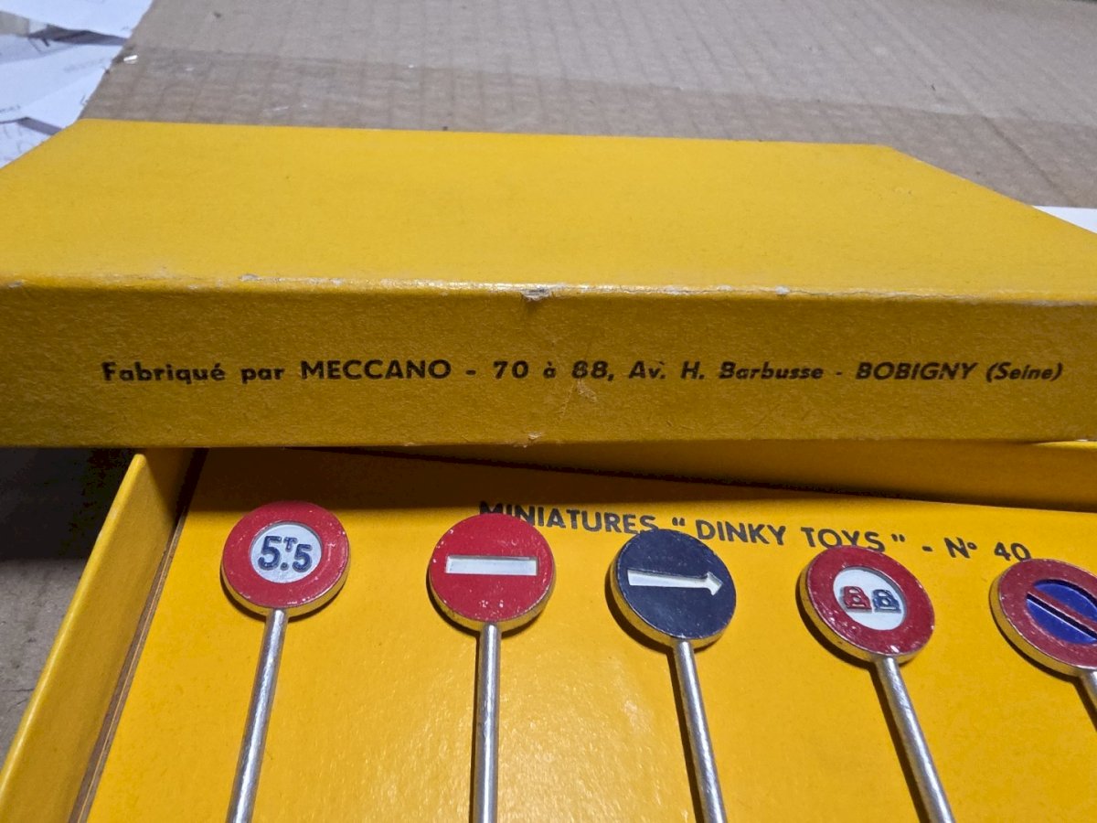 Boite de 6 panneaux de signalisation Ville - Dinky Toys France 40, 1952/59 - TBE. État:Occasion: Objet ayant été utilisé. Consulter la description du vendeur pour avoir plus de détails ...Occasion: Objet ayant été utilisé. les éventuelles imperfections. Année du véhicule:1952 Marque:Dinky Échelle:1:43 Pays d'origine:France Matériau:Métal Numéro de pièce fabricant:40