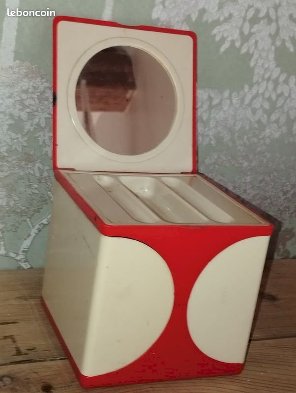 À découvrir : un véritable collector des années 1970 ! Cette boîte de voyage pour maquillage est rare et difficile à trouver, surtout dans cette combinaison orange et beige, typique du style rétro 70’s.