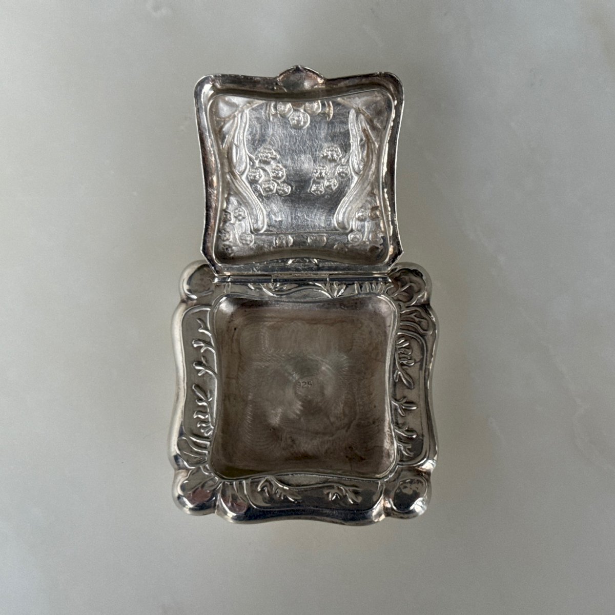 Boite en argent Art Nouveau 1900 décor de végétaux M3970 Cette boite en argent, typique 1900, porte un marquage "925" ainsi qu'un poinçon à l'intérieur. Pour l'état, notons des traces d'usure classiques, elle reste cependant dans un bon état général. Nos photos vous permettent d'apprécier la qualité de l'objet. Merci de bien détailler les photos. N'hésitez pas à zoomer . Les photos font partie intégrante de la description. Dimensions : Longueur : 5 cm Largeur : 5 cm Épaisseur : 1,2 cm Poids : 27 g P : 1697210 Je reste à votre disposition pour toute question. Type:Objet de vitrine, Décoratif Période:Design du XXème Sous-type:Boîte Pays d'origine:France Hauteur:1,2 cm Matière:Argent massif Style:Art Nouveau Longueur:5 cm Largeur:5 cm
