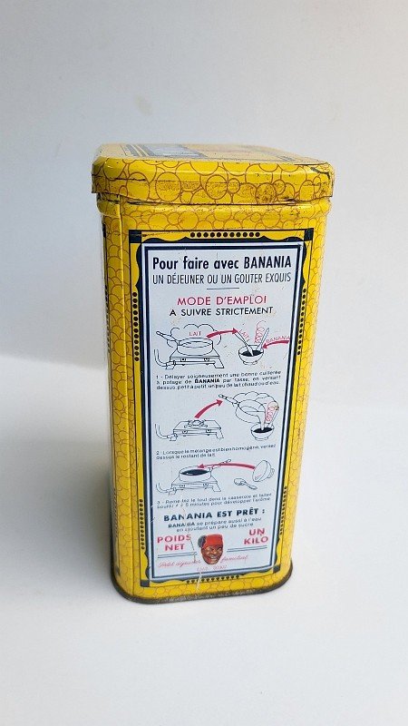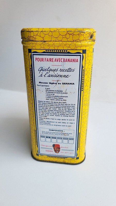 jolie boite publicitaire Banania ancienne elle est en bon état dans son jus elle est en tôle elle mesure 12 cm de large sur 8.3 cm de profondeur et 17.7 cm de haut Sous-thème:Chocolat Matière:TOLE Thème:Produit alimentaire Pays d'origine:France métropolitaine