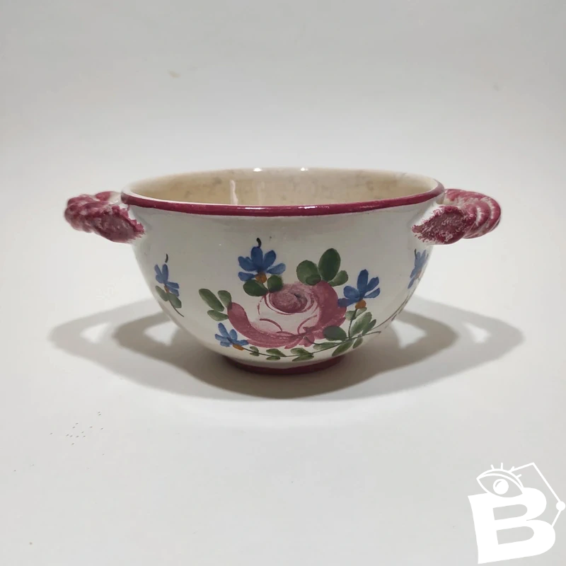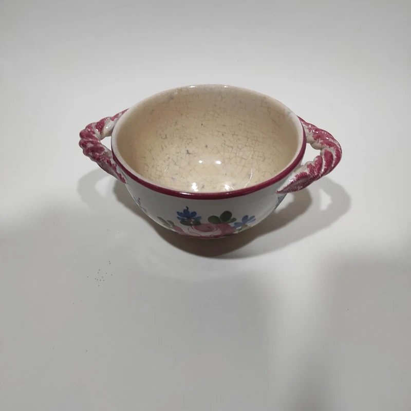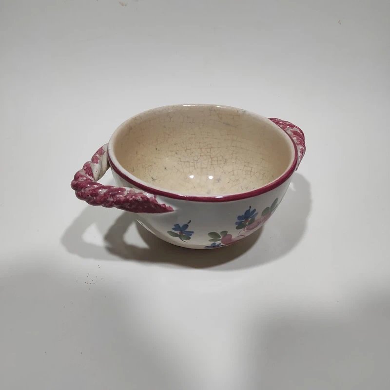 Bol à oreilles en faïence avec décor floral et inscription à la main souvenir "Saint Denis d'Oléron" Décor main Signé au dessous En très bon, traces du temps mais état pas d'éclat Mesures en photos Envoi rapide et soigné ??