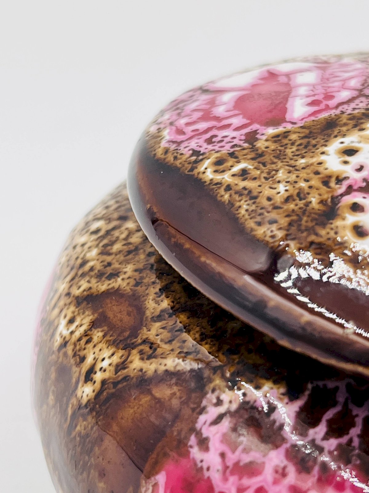 Avec ses nuances de brun, de rose et de blanc, elle évoque une élégance intemporelle et un charme vintage.- Fabriquée en céramique, cette bonbonnière témoigne du savoir-faire artisanal de Vallauris, célèbre pour ses créations uniques et raffinées.- Son design captivant et ses couleurs vibrantes en font un objet décoratif idéal pour ajouter une touche artistique à votre espace de vie.- Parfaite pour conserver vos douceurs préférées ou simplement comme pièce de collection, elle incarne l'alliance parfaite entre fonctionnalité et esthétique.N'attendez plus pour enrichir votre collection avec cette œuvre d'art exceptionnelle.Dimensions : 13 x 13 x H 7 cm.