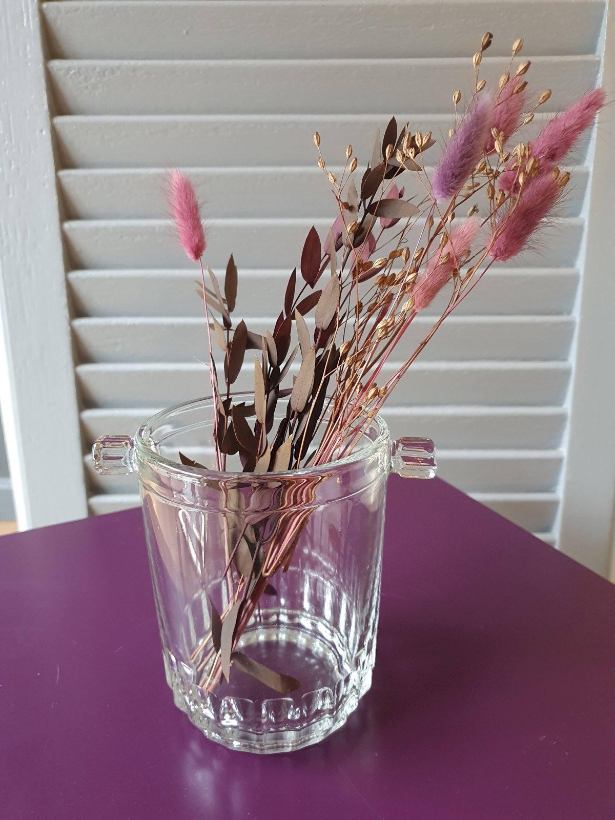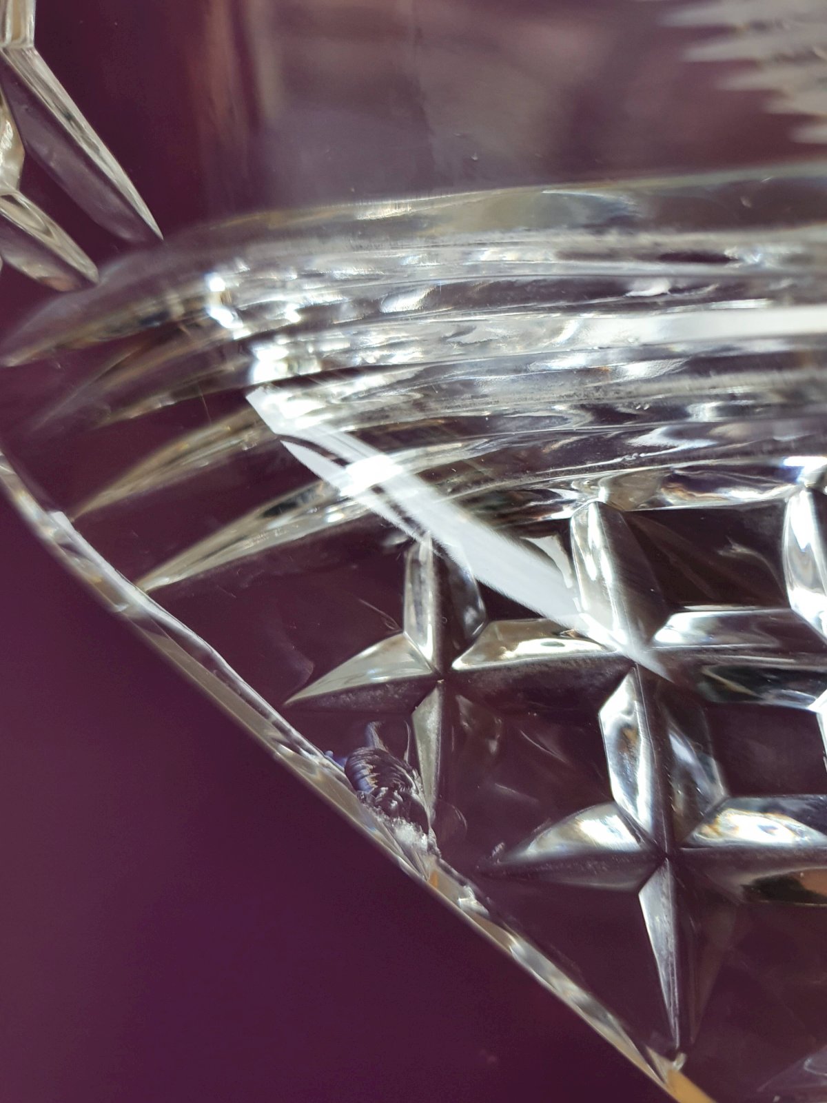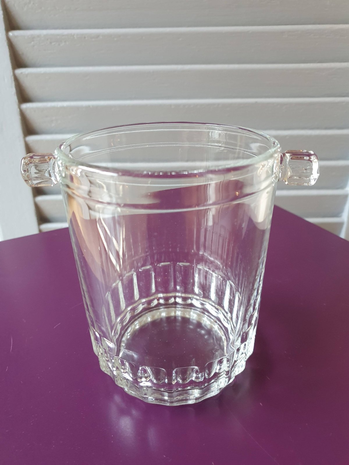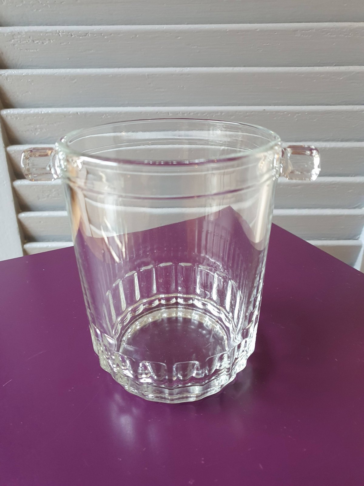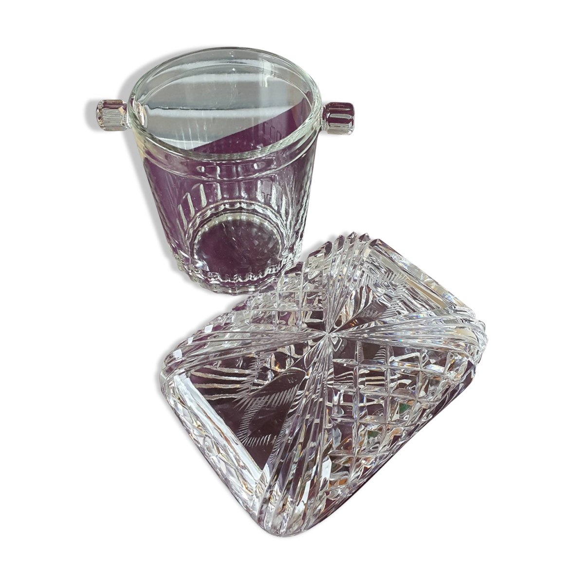 Ensemble de 2 pièces vintage, comprenant une bonbonnière en verre transparent, verre ciselé, la bonbonnière comporte 1 impact sur le côté, 2 impacts au niveau du couvercle non visible, à l'intérieur, pas de fêlure.Ainsi qu'un petit seau à glaçons en verre transparent, on peut le détourner en vase, bon état général, pas d'impact ni fêlure.Bonbonnière.L17, 5 cm X H5 cm X P12 cm.Seau.L15, 5 cm X H14 cm X P10, 5 cm.