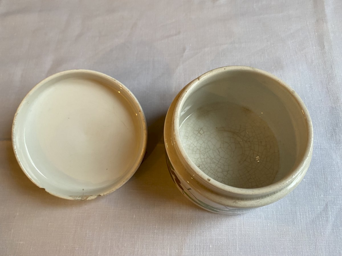 10 cm de largeur ; 7 cm de haut ; couvercle 9,5 cm de diamètre