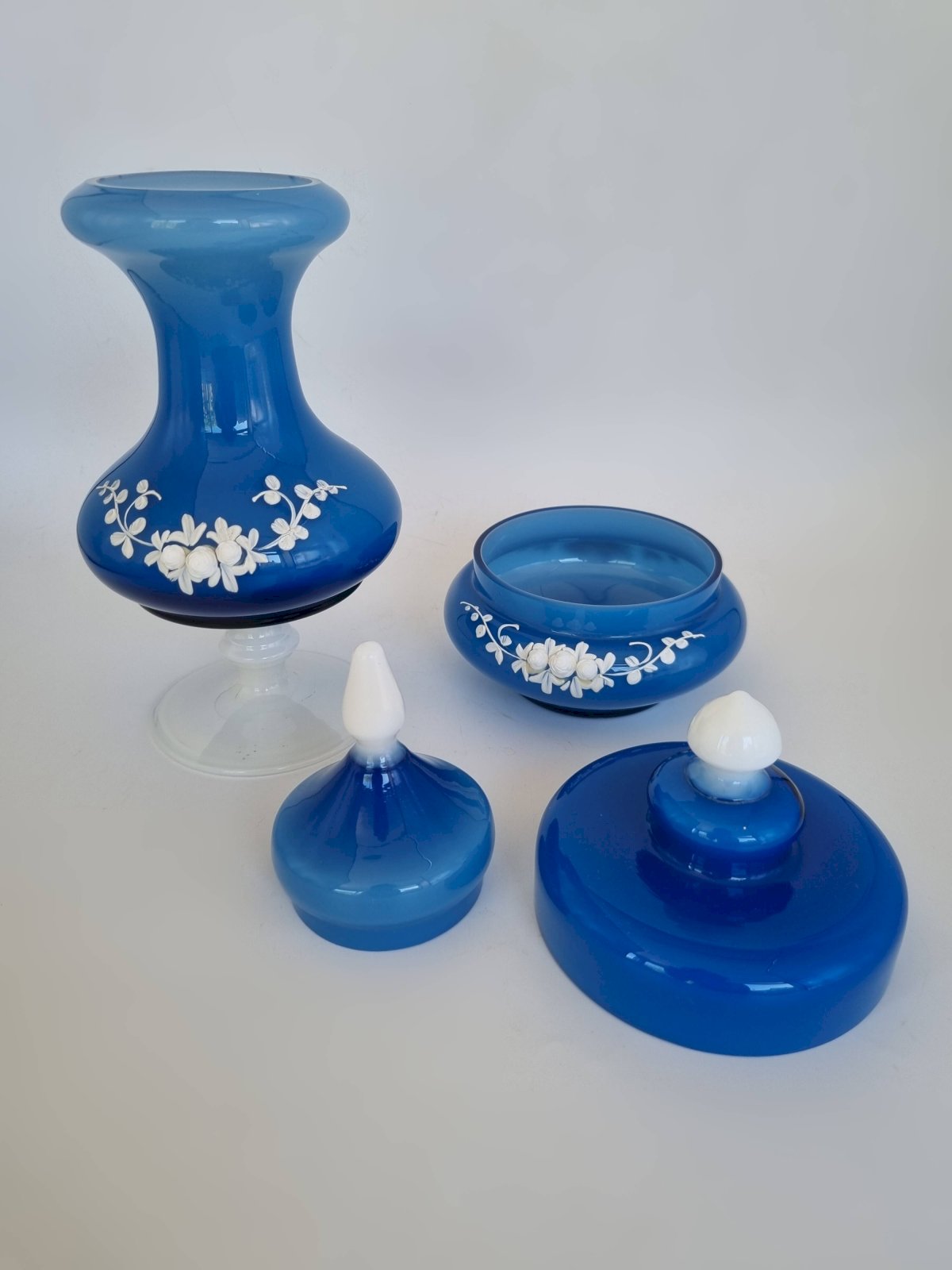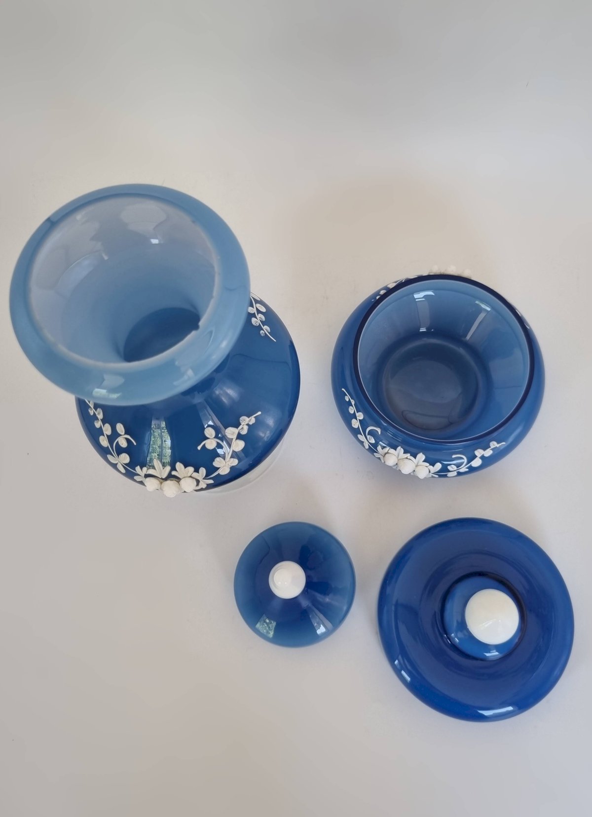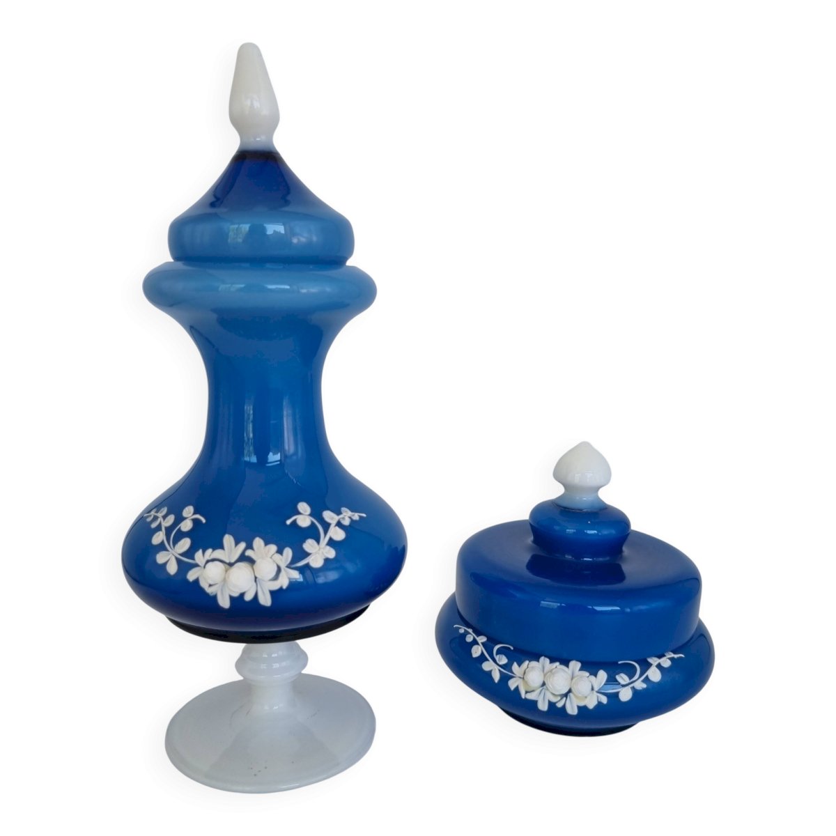 Accessoires de toilette en opaline bleue, un pot d'apothicaire et une boîte.Dimensions: environ 13 X 13 cm et 28 X 12 cm.Poids du duo: 1.3 kg.