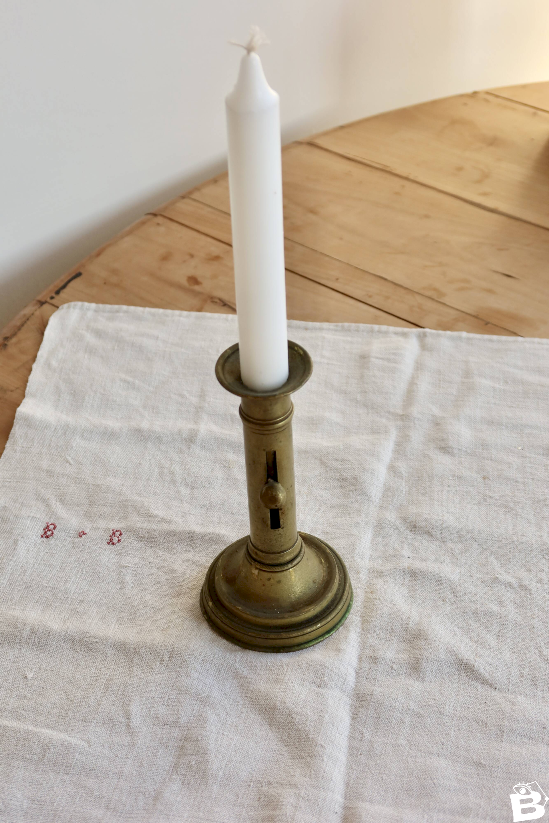 Bougeoir ancien en laiton équipé d’un système à bouton poussoir permettant d’ajuster la hauteur de la bougie.