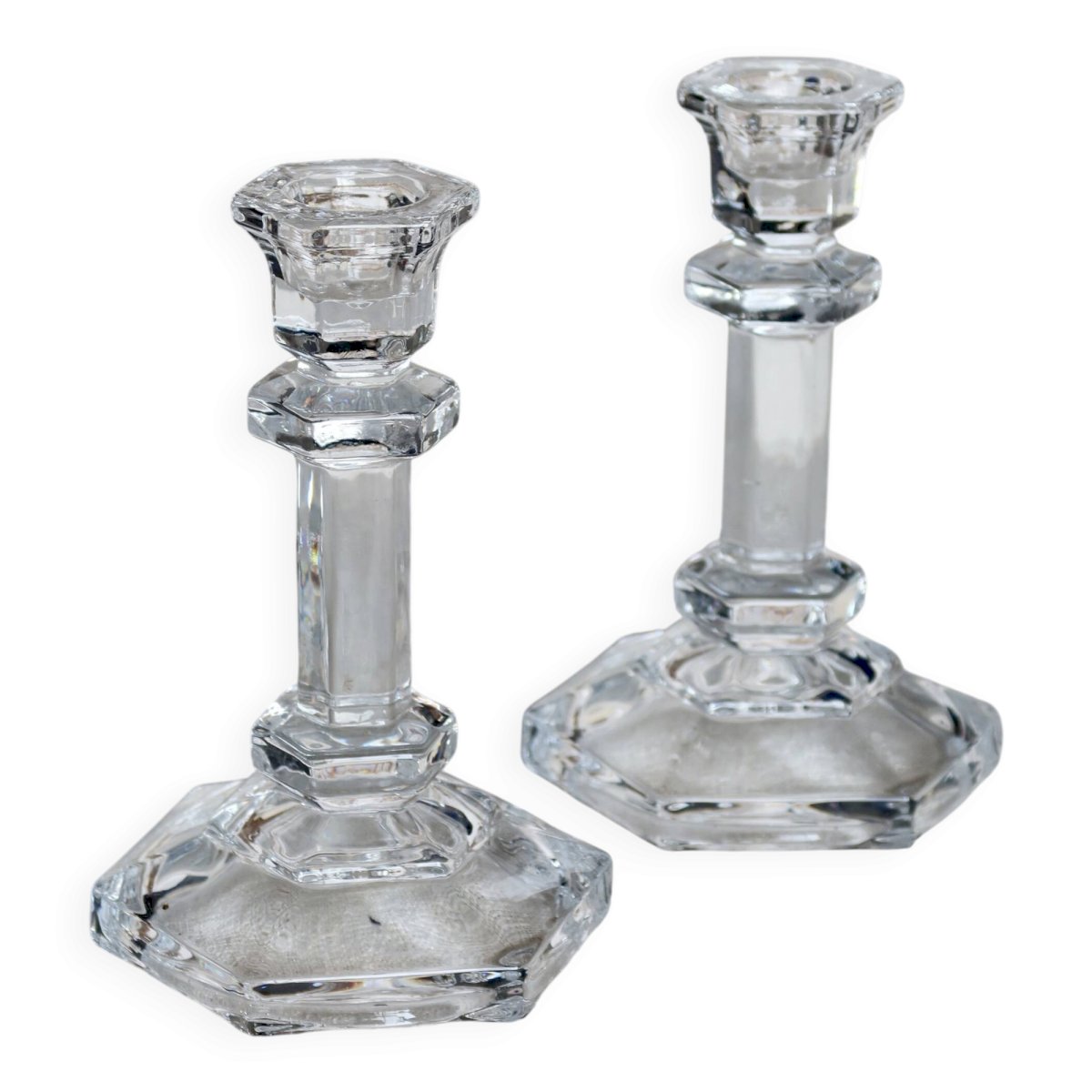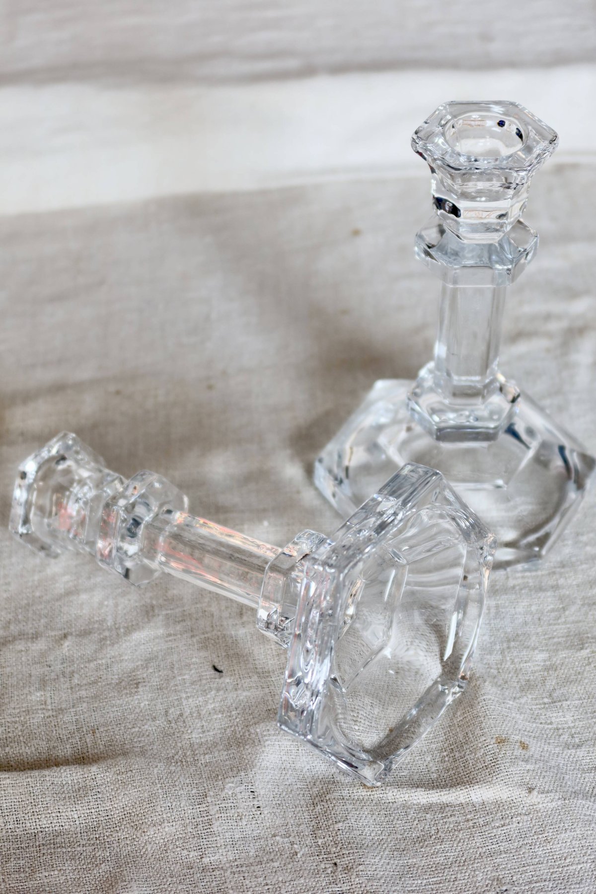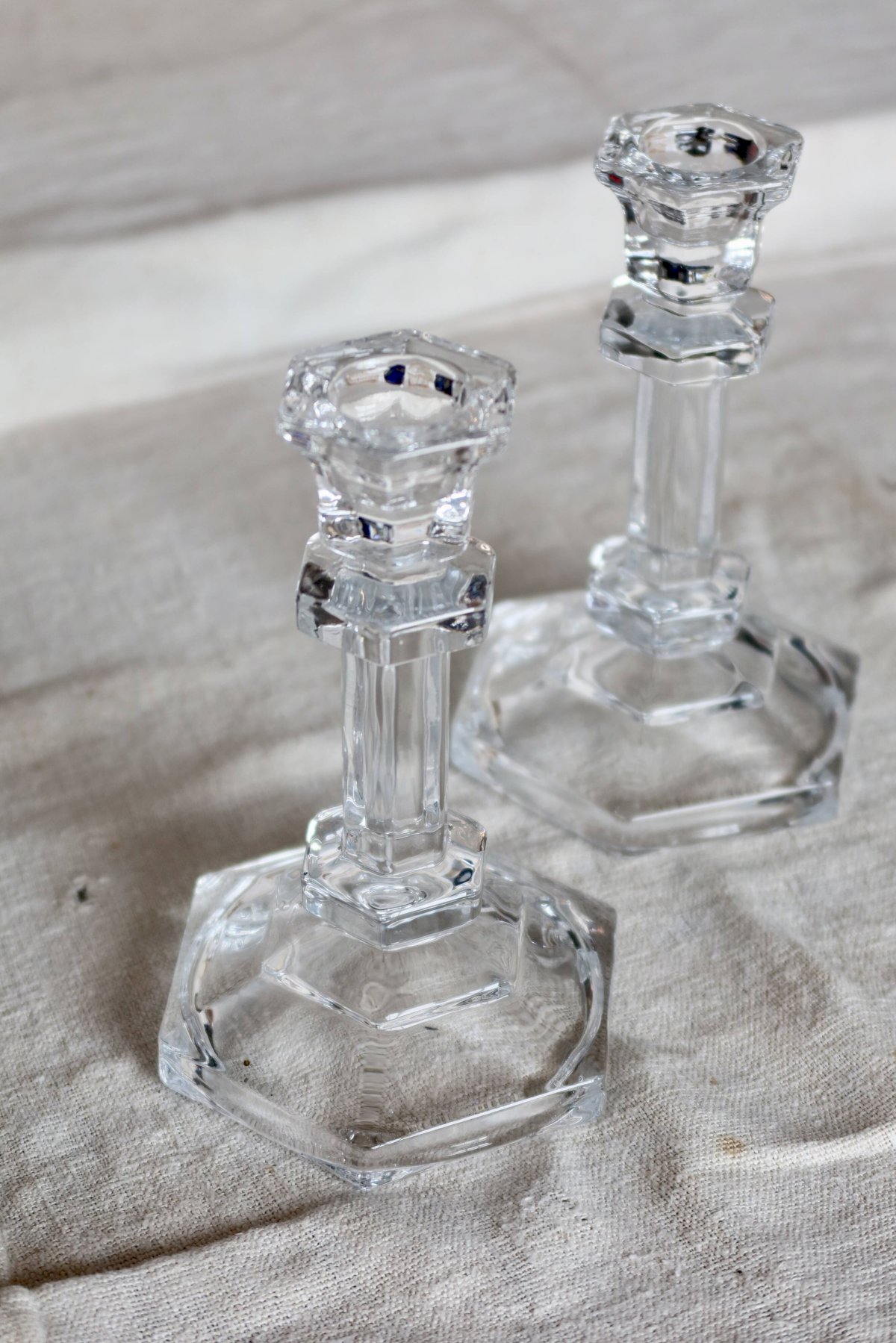 Élégants bougeoirs en verre transparent, à fût et base octogonaux.