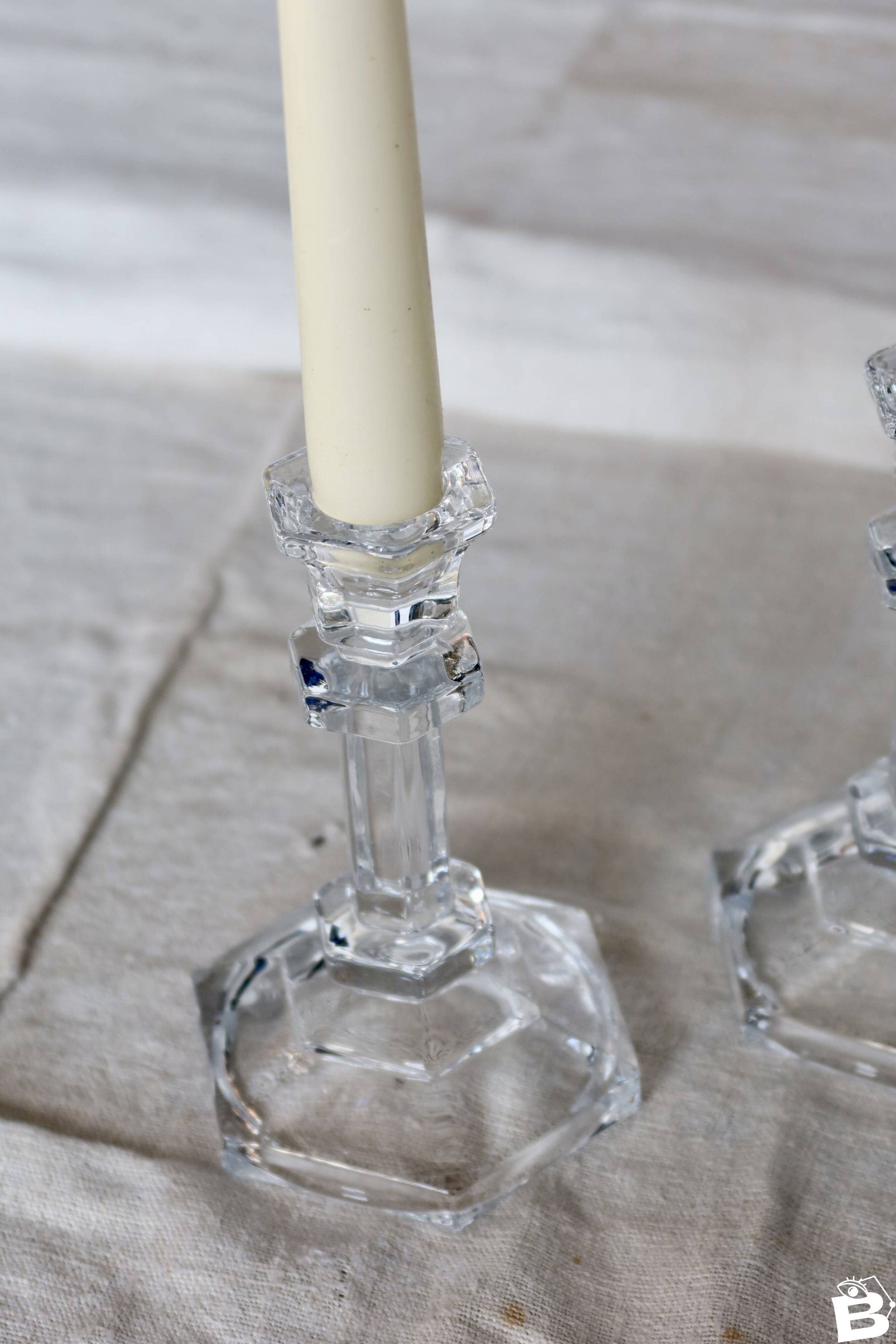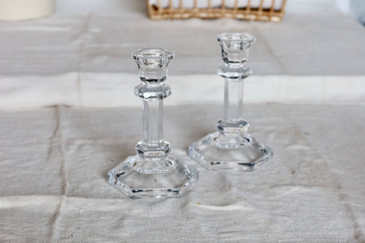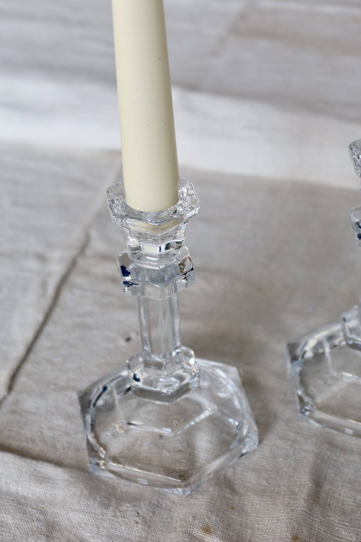 Élégants bougeoirs en verre transparent, à fût et base octogonaux.