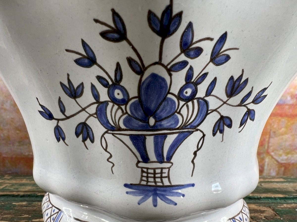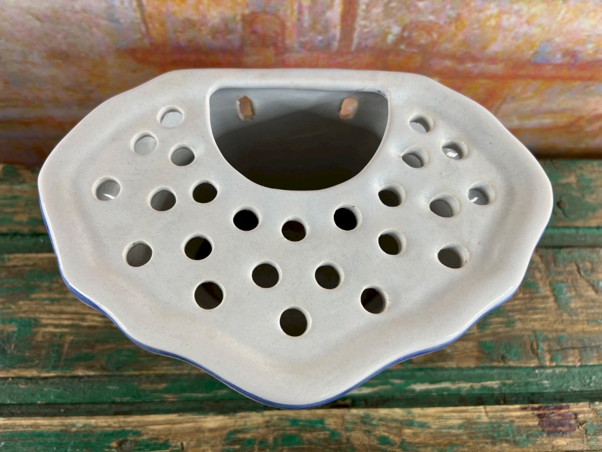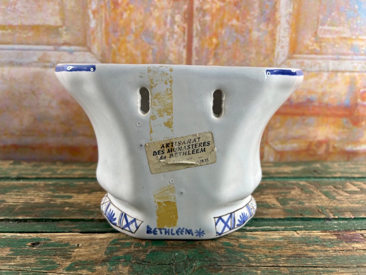 Charmante bouquetière murale en faïence artisanale, réalisée par l’ Artisanat des Monastères de Bethléem , célèbre pour son savoir-faire traditionnel et sa douceur méditative. Décorée à la main d’un panier fleuri bleu cobalt sur fond blanc, elle présente un ajourage supérieur pour disposer des fleurs, et deux perforations à l’arrière permettant la suspension murale. Chaque détail respire la paix et la simplicité monastique , typique des productions des communautés de Bethléem. Une pièce rare et délicate, parfaite pour une touche spirituelle et authentique dans un intérieur de charme. Signature : “Bethléem” sous la base, étiquette d’origine au dos. Dimensions : Hauteur : 12,5 cm (4.9") Largeur : 19 cm (7.5") Profondeur : 13 cm (5.1") État : excellent état général, légères traces d’usage, aucune fêlure. Matière : faïence vernissée Origine : Artisanat des Monastères de Bethléem, France État:OccasionObjet ayant été utilisé. Objet présentant quelques marques d'usure superficielle, entièrement opérationnel et fonctionnant correctement. Il peut s'agir d'un modèle de démonstration ou d'un objet retourné en magasin après une courte période d'utilisation. les éventuelles imperfections. Couleur:Bleu Type:Vase Matériau:Céramique Thème:Fleur, Jardin
